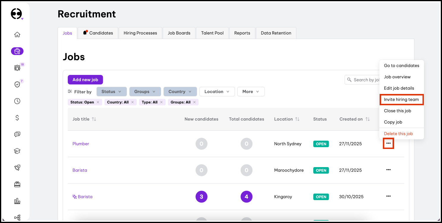 - From the main Recruitment page - locate your job in the jobs list, click the three dots menu […], and select Invite hiring team