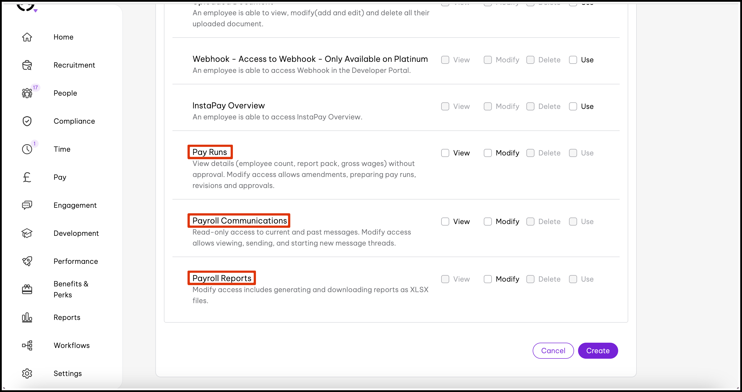 - Pay runs: View gives access to pay run details (employee count, report pack, gross wages) without approval. Modify access allows amendments, preparing pay runs, revisions and approvals.