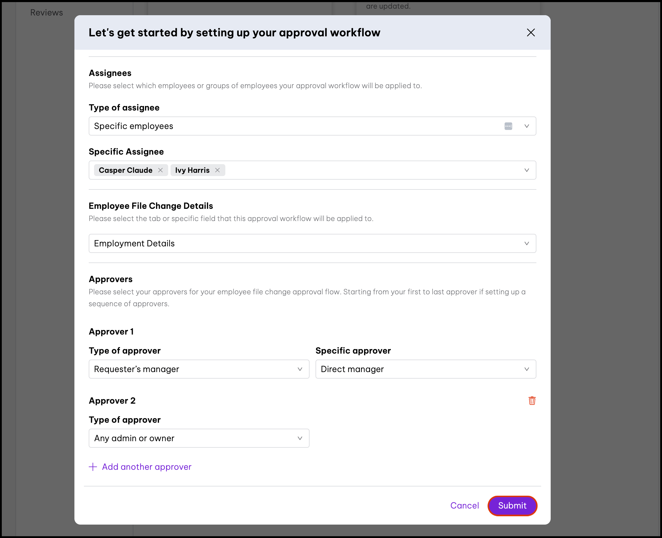 When changing an employee file record, the Workflow feature will let you customise the notification and approval flow for this change request. For example, when an employee discloses a medical issue, the feature can be used to let their line manager know about this change. The feature also follows a "when-if-then" sequence. To learn more about this process, please refer to The When-If-Then sequence and scenarios tab in the Further information section of this article.