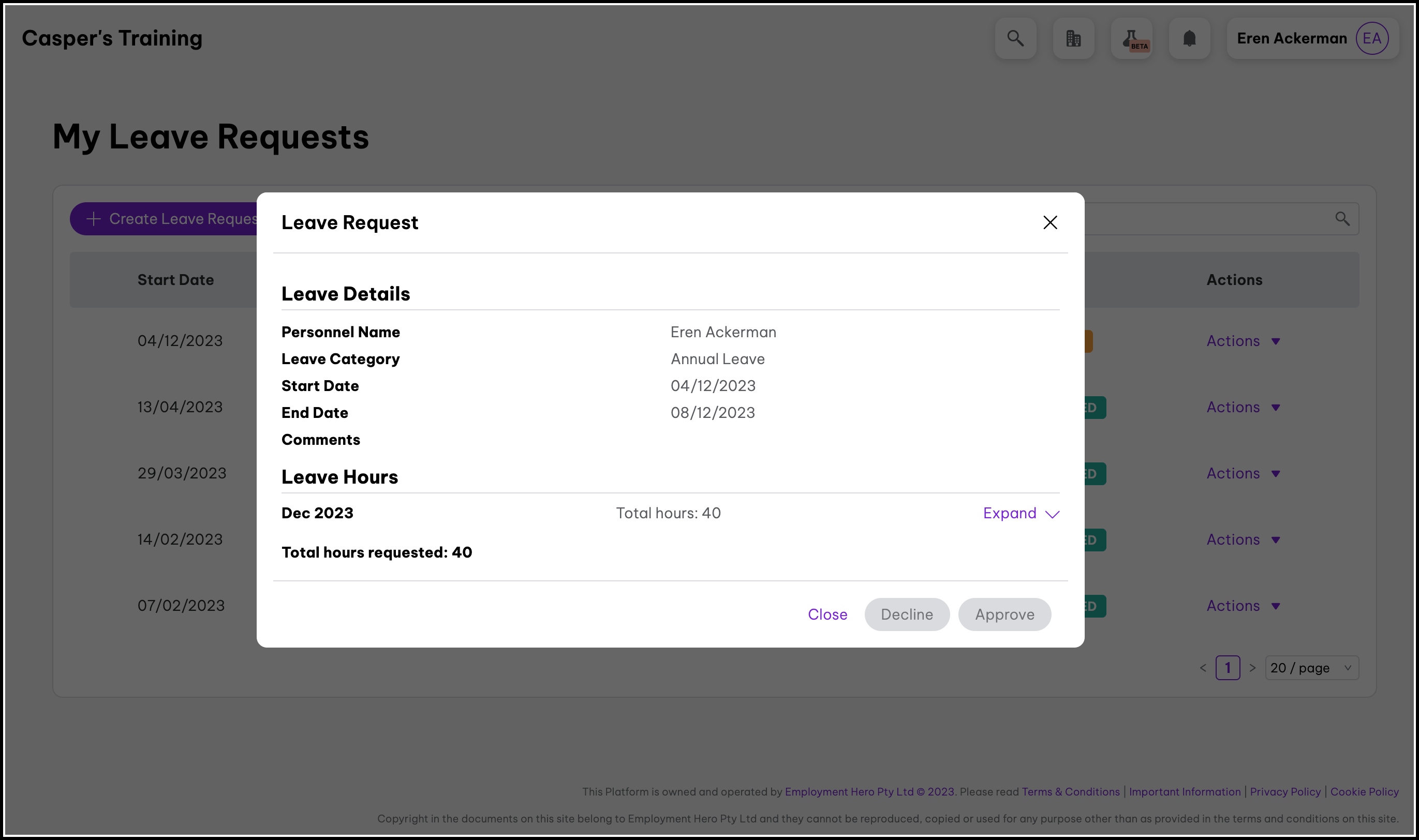 You can only view a leave request if the Payroll classic platform has processed it in a pay run and imported the pay slips into Employment Hero.