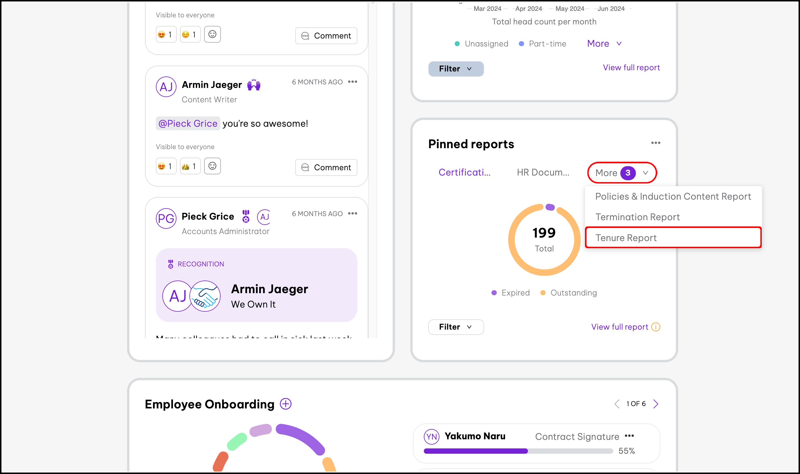 You can pin reports to your dashboard using the Pinned Reports widget. This feature lets you have easy access to up to five reports, depending on what you need, and arrange them based on importance. You can pin Policies and Induction Content, Certifications, HR Documents, and Tenure Reports, along with your Workforce Snapshot or your Termination, Work Eligibility, and Tax Reports.
