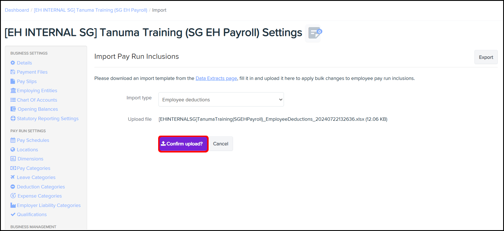 - Upload the updated spreadsheet file by clicking Confirm upload.