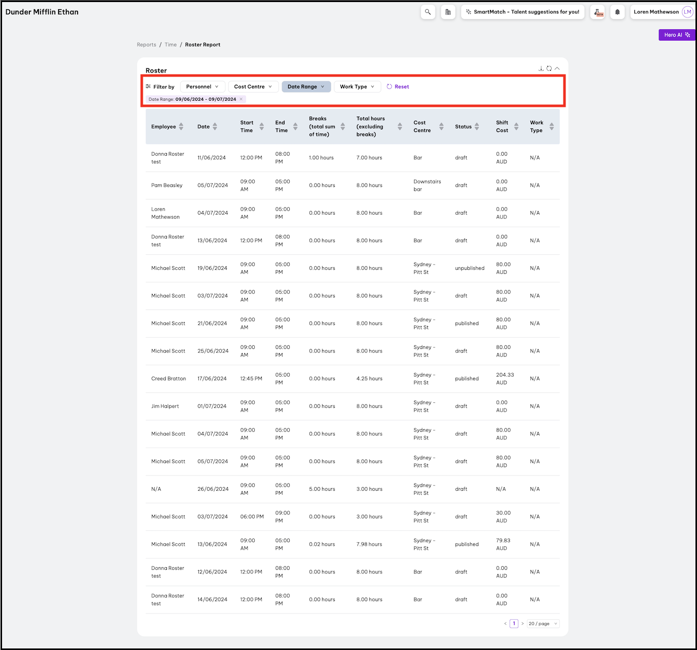 Admins and managers can filter, view and download the rostering report in the reports module on the platform.