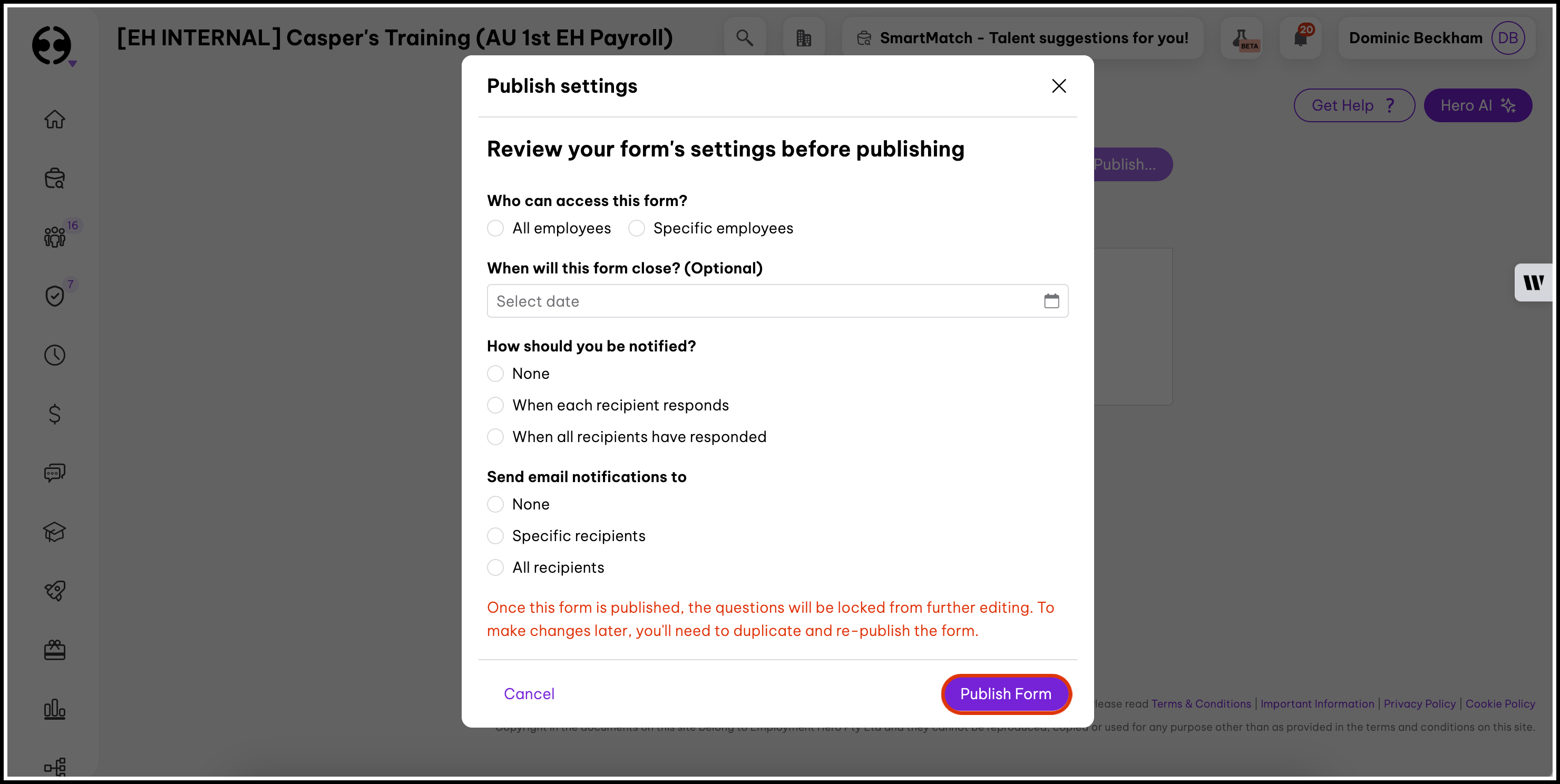 Publishing a form makes it available in the Company Forms library for employees to access. Publishing does not automatically create tasks or send notifications—to request employees complete a form, you need to assign it separately.