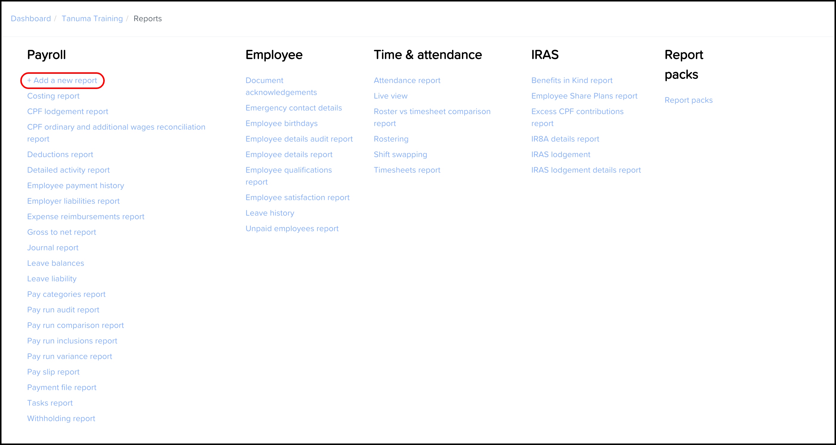 - Under Payroll, click +Add a new report.