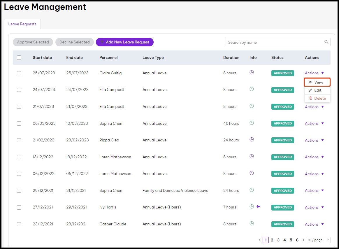 When searching for an employee's leave request on the Leave Management page, only direct reports will show up initially. You can use the filters to find other leave requests. For employees with no manager, you must ensure the Reporting personnel filter is set to All personnel.