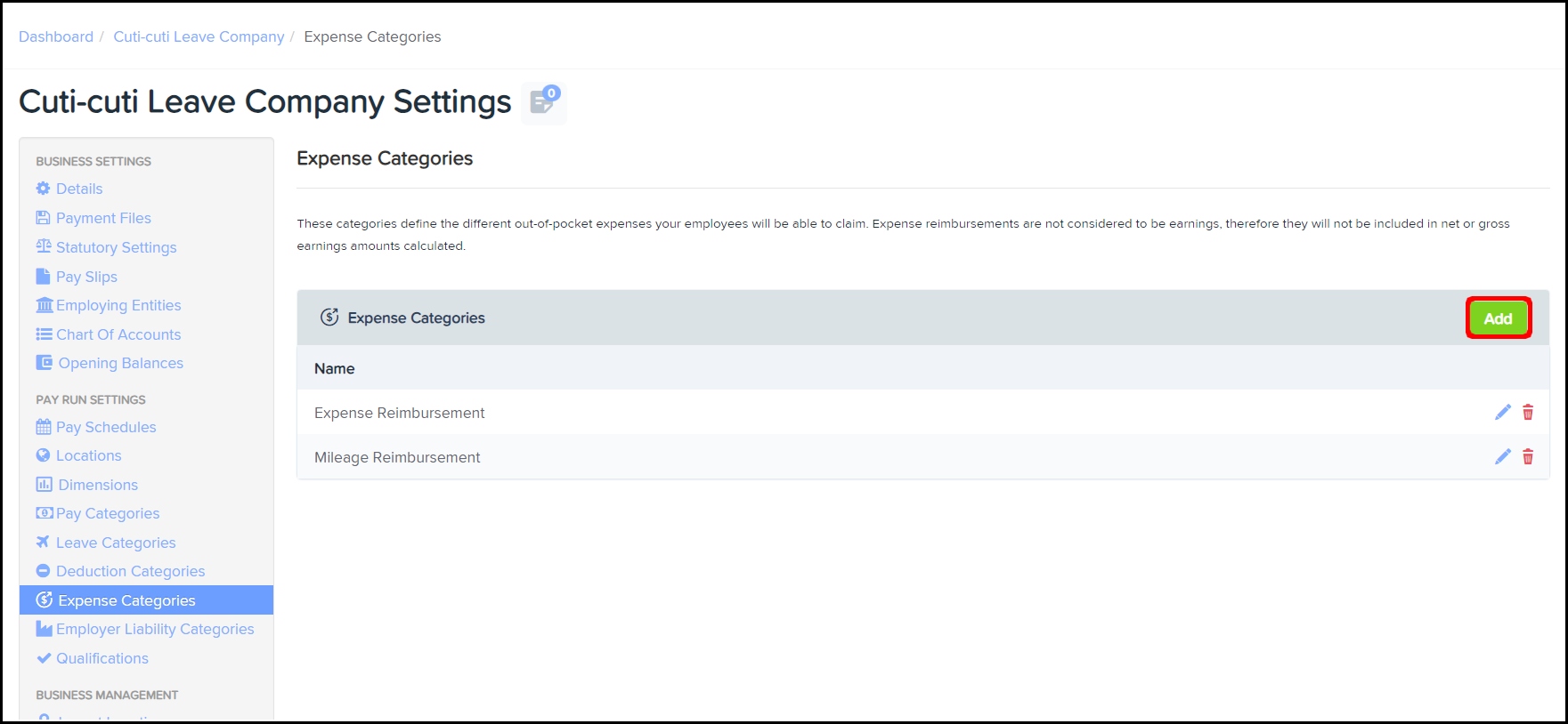 5. Click on Add. Screenshot of expense categories page, highlighting add button