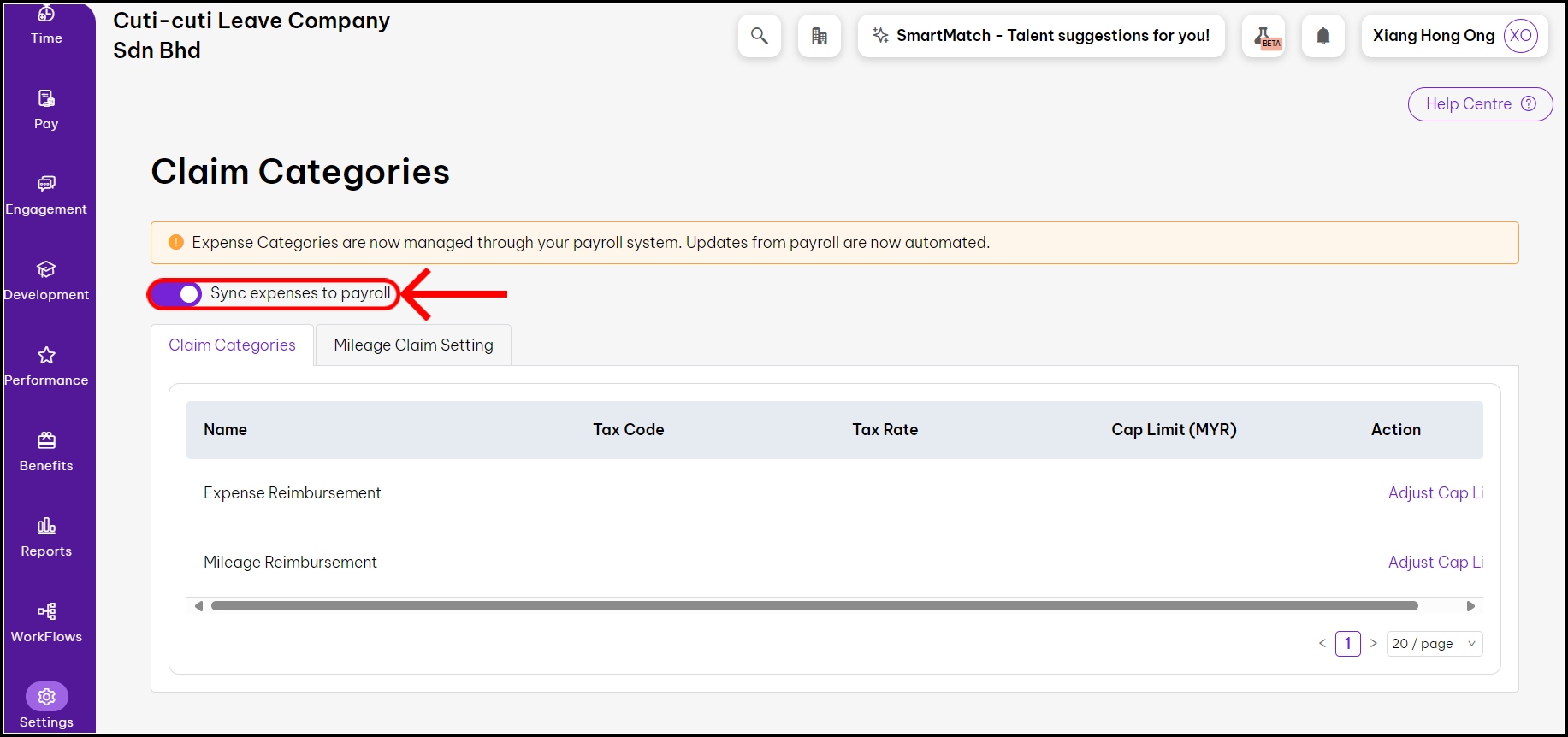 11. Ensure that Sync expenses to payroll has been toggled on so that your new mileage reimbursement expense category syncs to Employment Hero.
