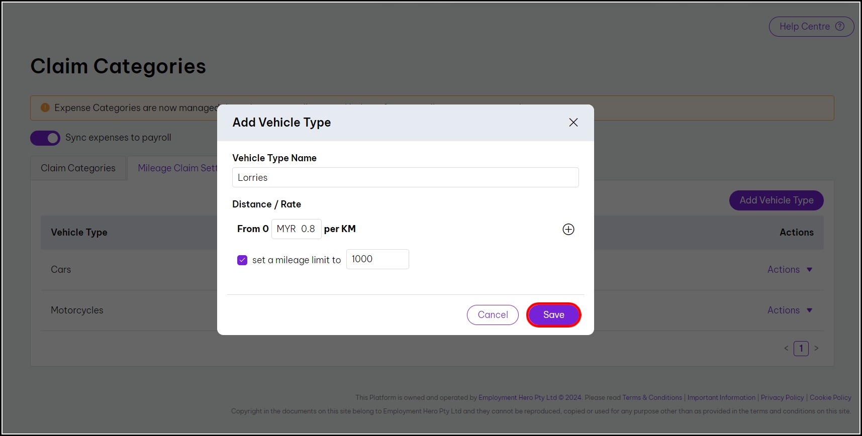 Once the mileage reimbursement has synced to Employment Hero, you can now proceed to set vehicle types and mileage rates.