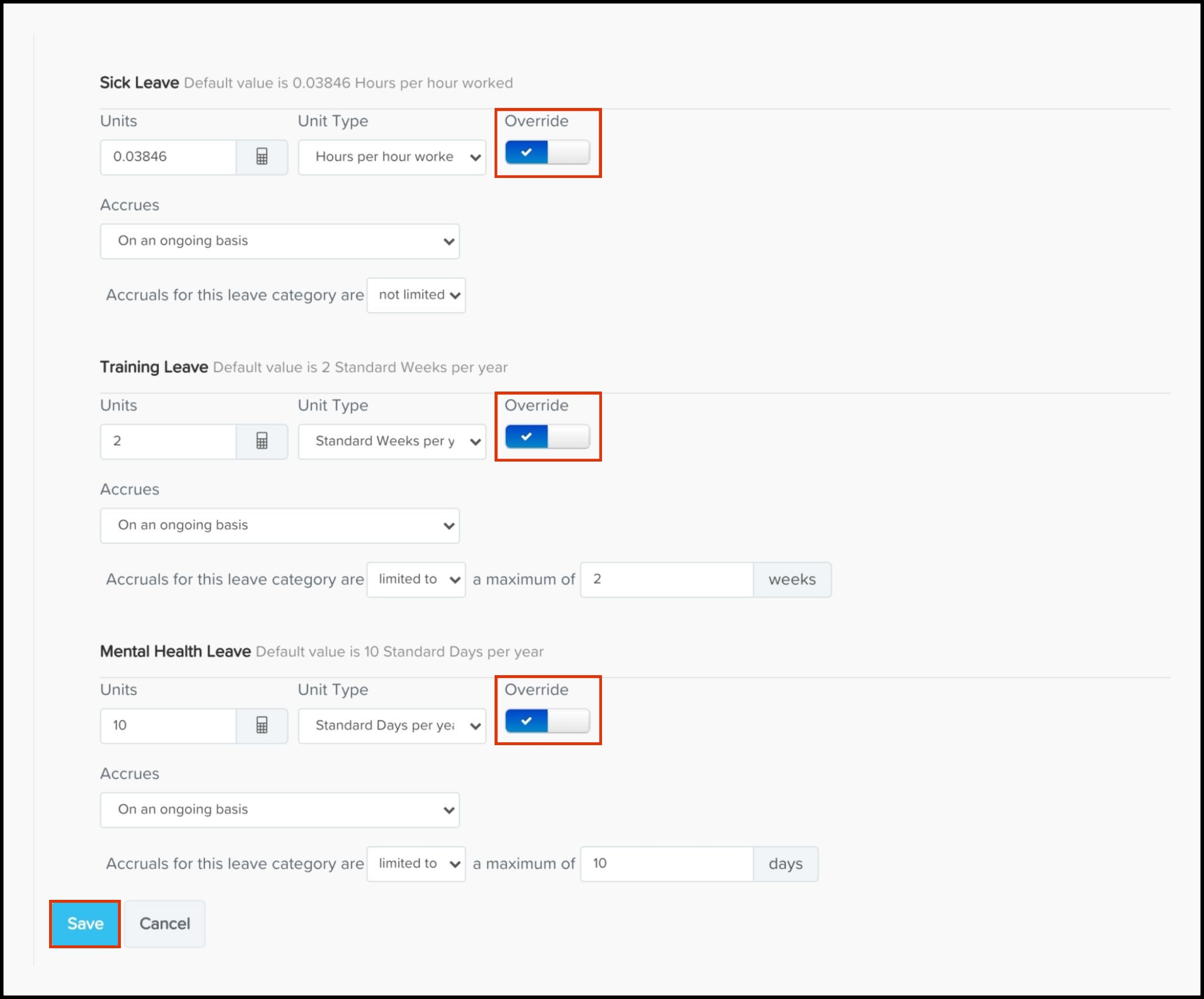 - In the Leave Allowance section, use the override toggle switch to change the data if required.