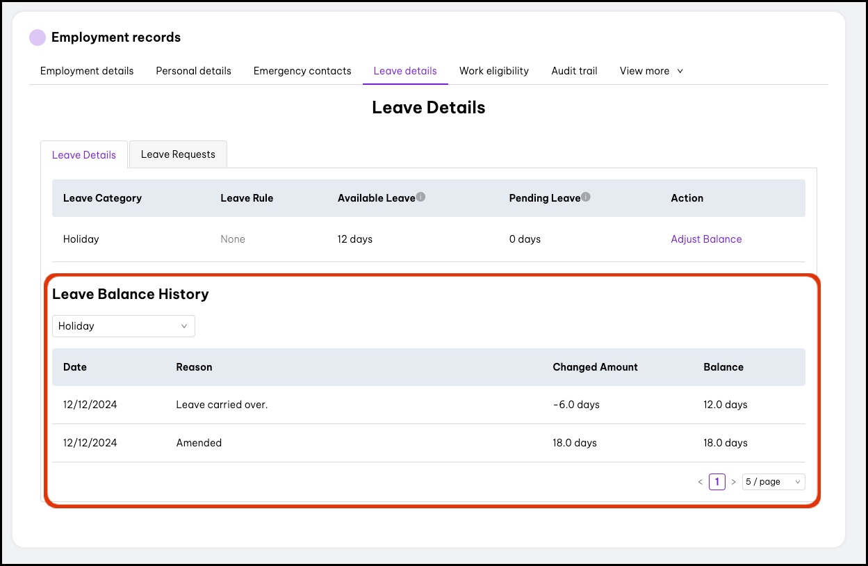 - You will now see a record of any leave balance changes under Leave Balance History.