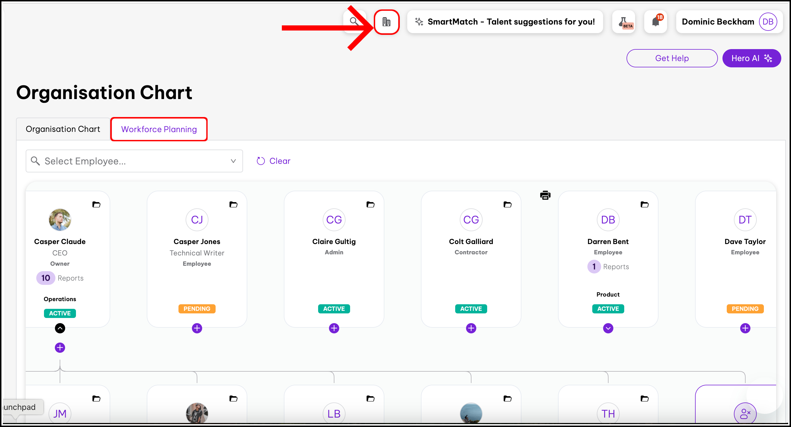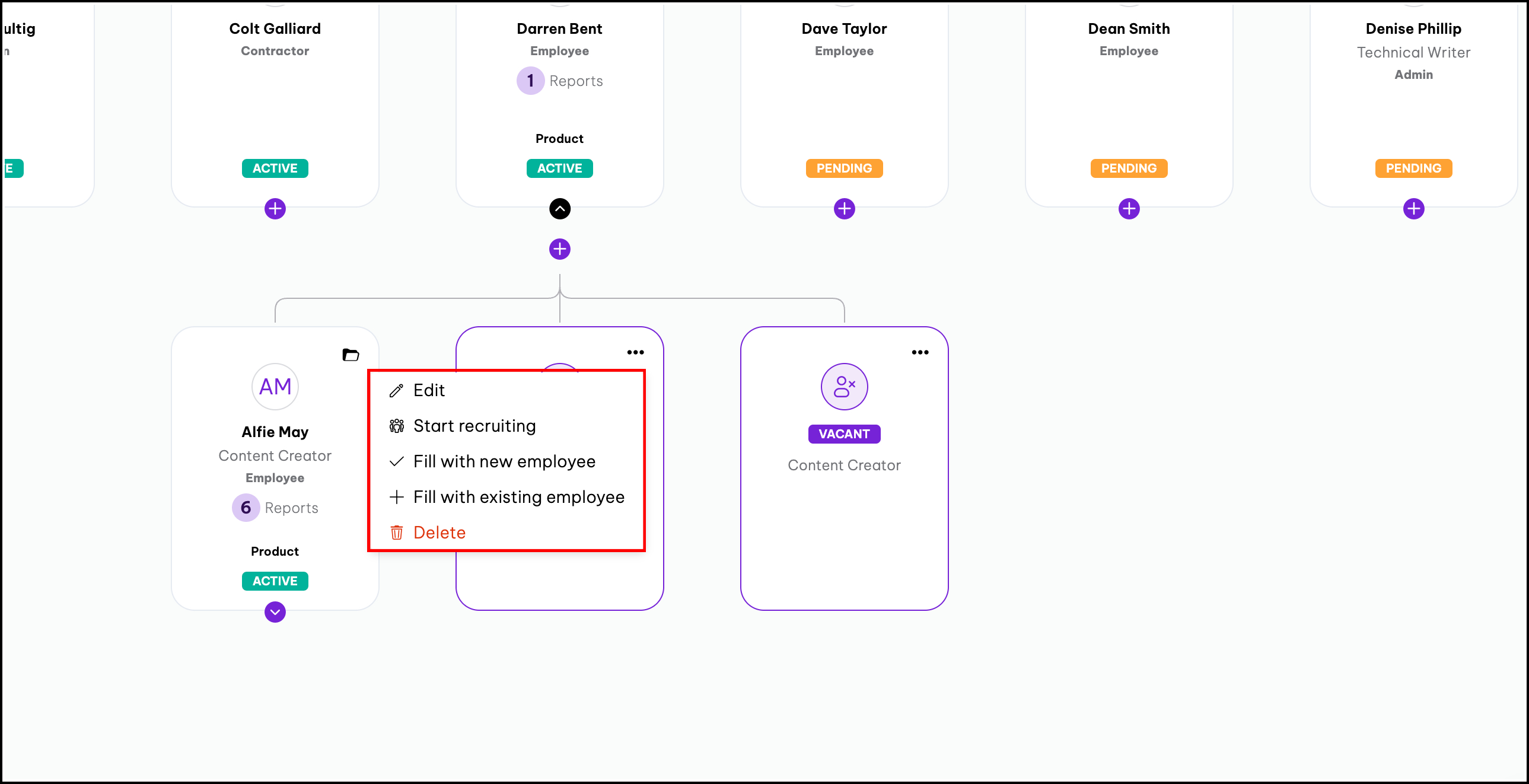 - Navigate to the vacant position you want to fill. You can scroll up and down along the organisation chart. You can also open up an employee's reports using the arrows next to their profile.