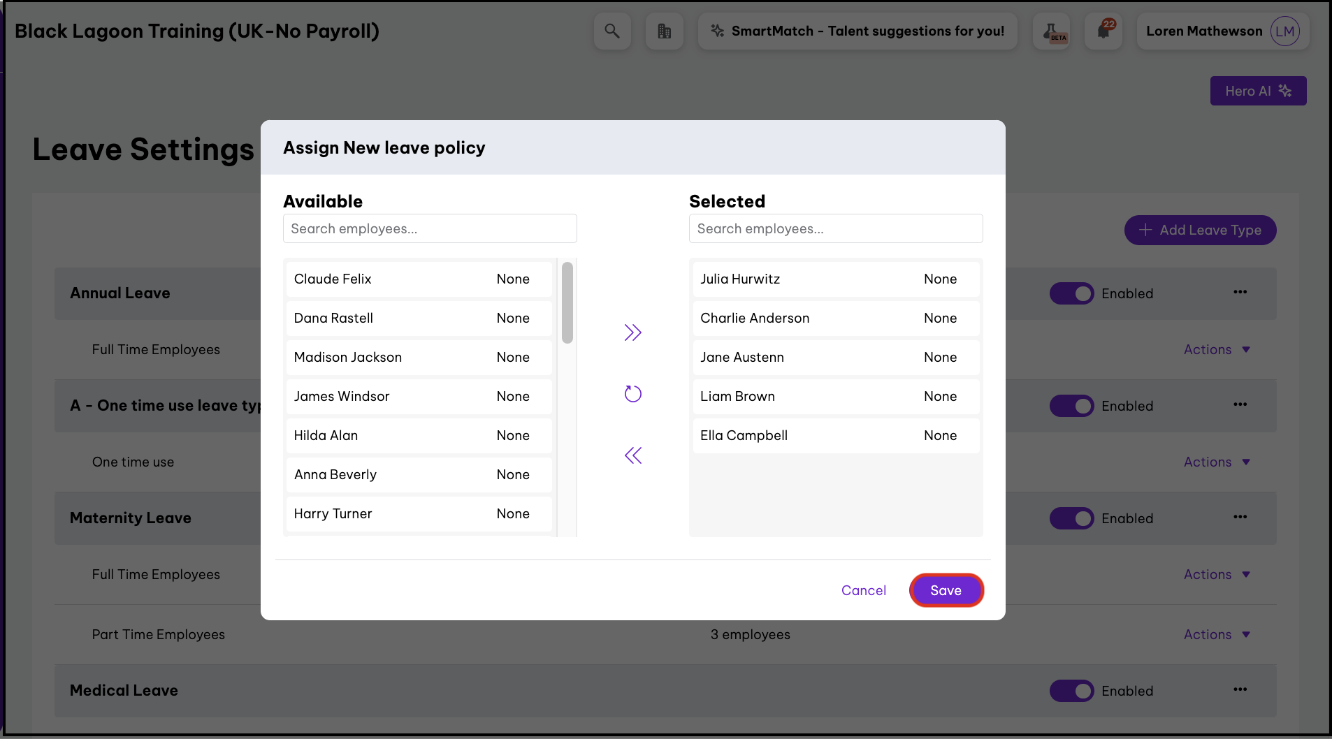 - To assign the policy to certain employees, drag their name from the Available column to the Selected column.