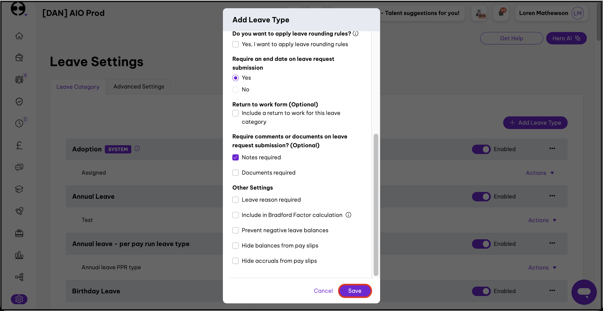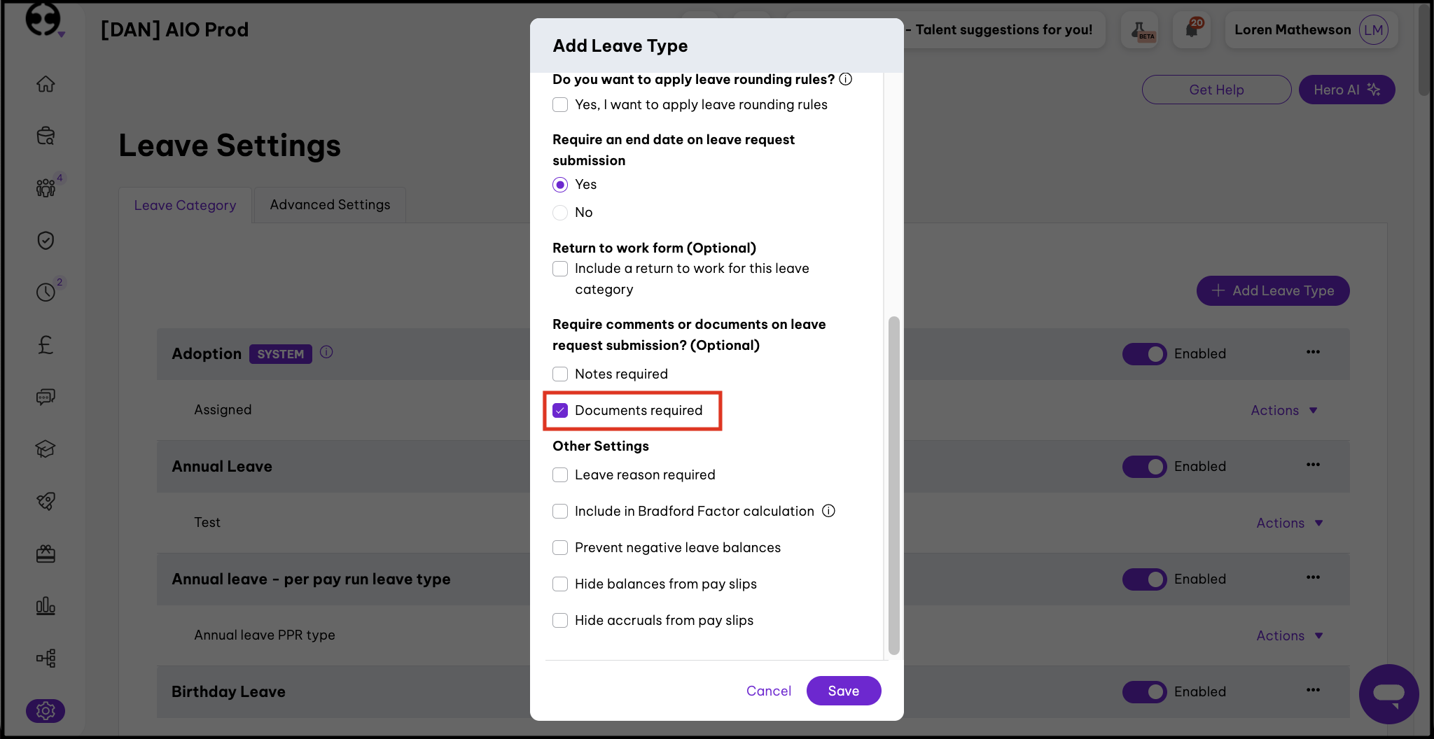 - Require comments or documents on leave request submission? - tick Documents Required.