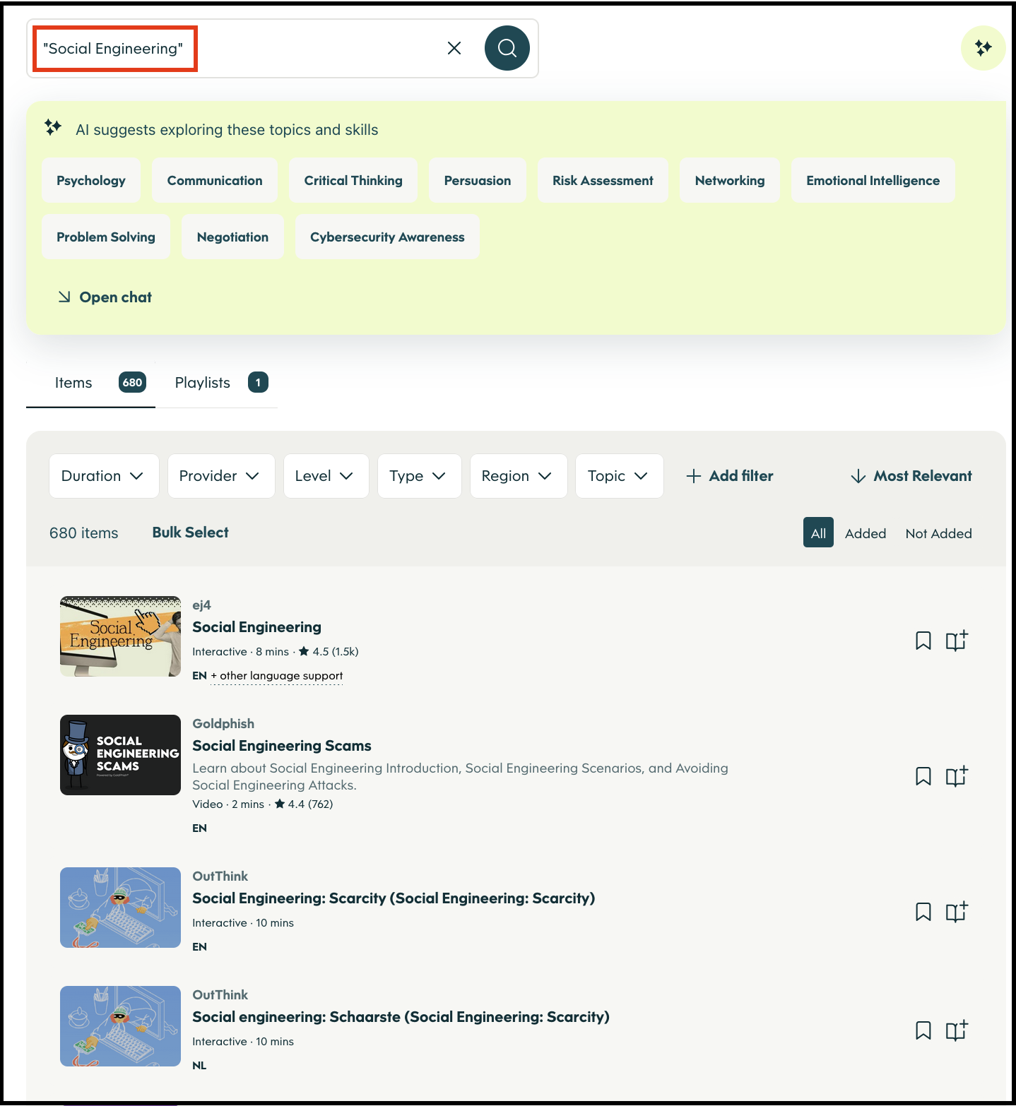 After performing a search, the filter will automatically change to Most Relevant, where Go1’s algorithm highlights the courses most relevant to your search.