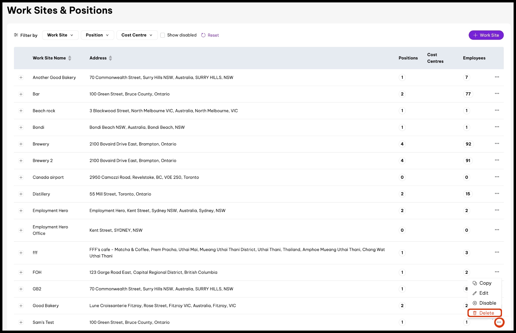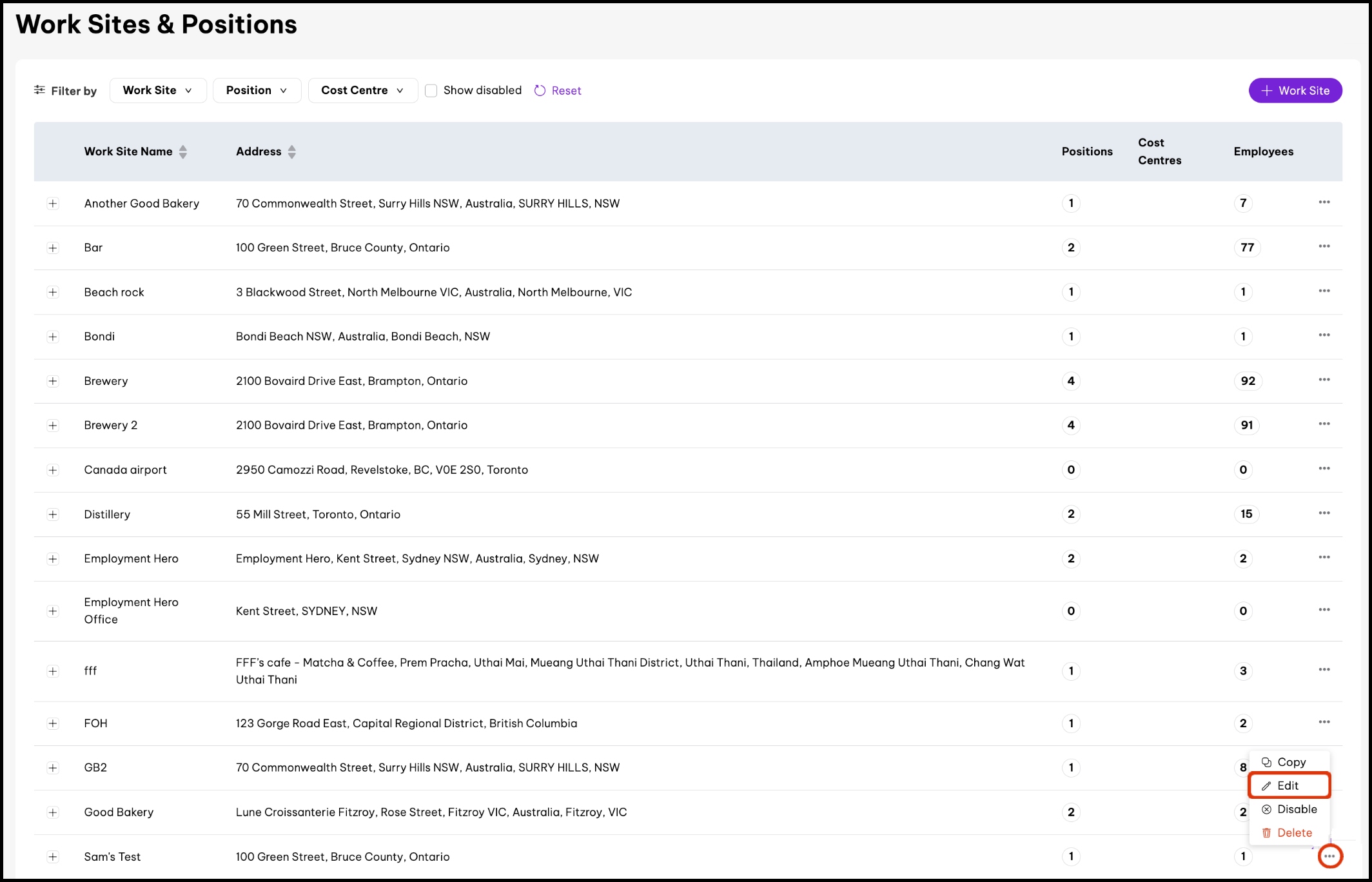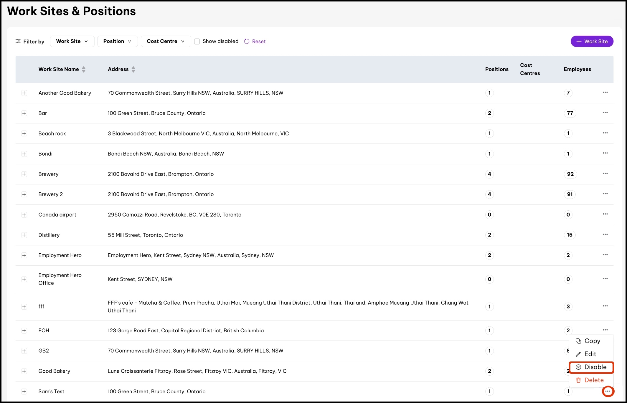 4. Select Disable. screenshot of Work Sites & Positions page, highlighting three dots (...) button and its Disable menu item