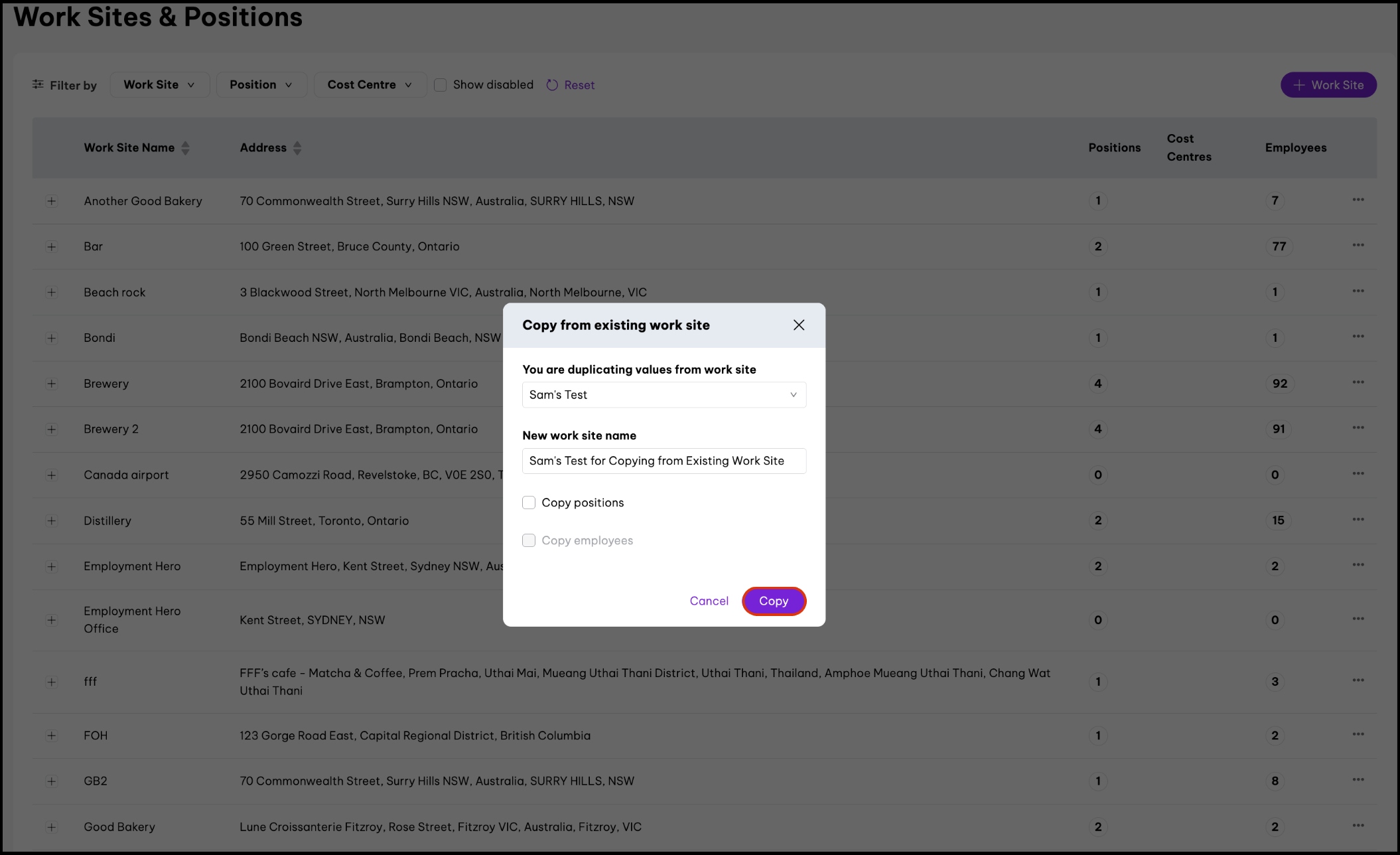 6. Click Copy.screenshot of Work Sites & Positions page's 'Copy from existing work site' popup, highlighting Copy button