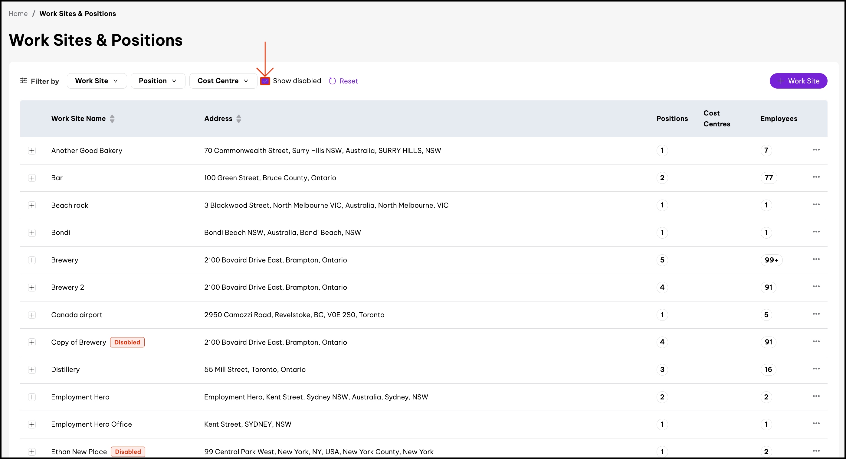 1. Scroll to the top of the Work Sites & Positions page and select the Show disabled checkbox. screenshot of Work Sites & Positions page, highlighting 'Show disabled' checkbox