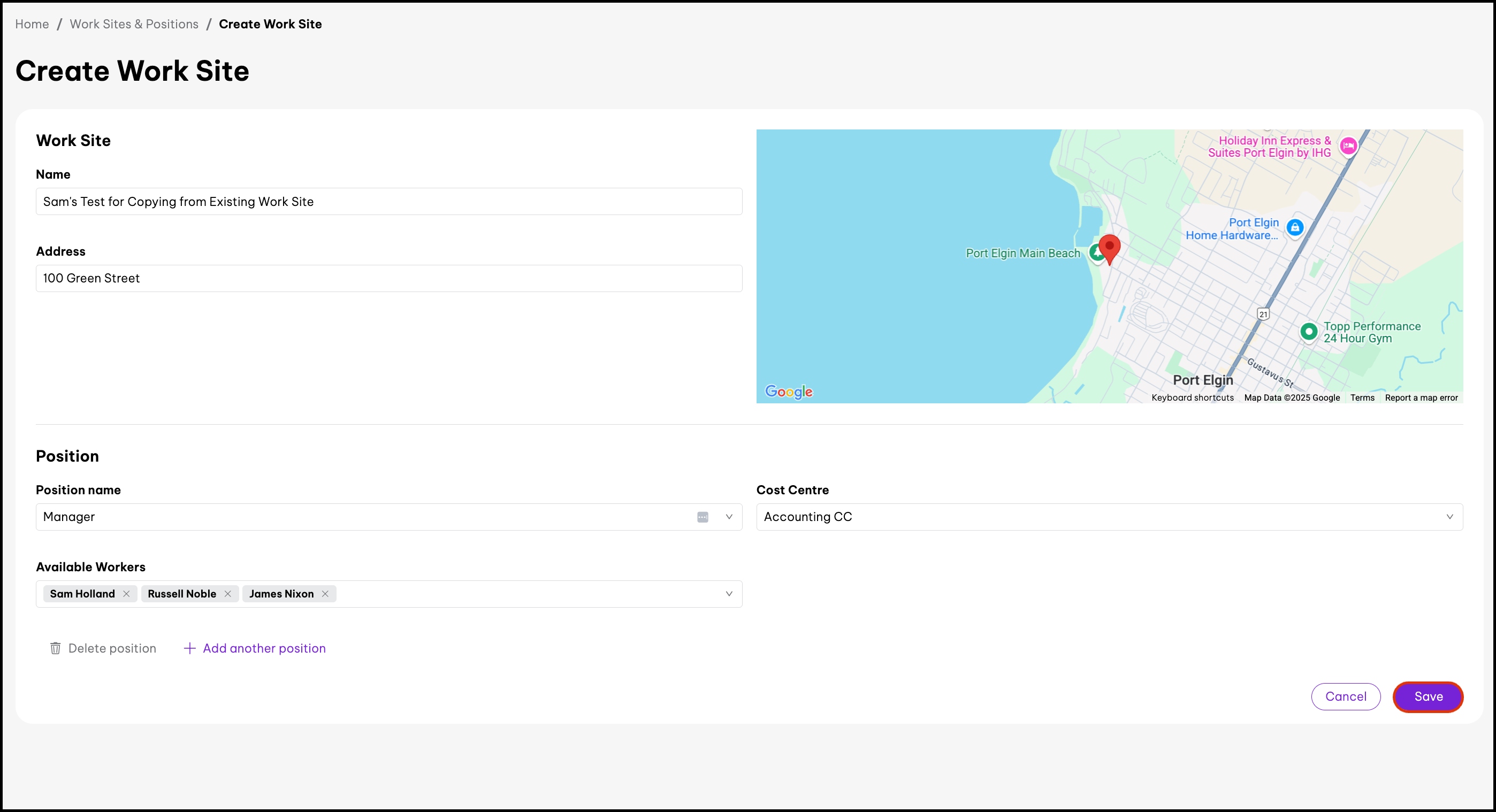 screenshot of Work Sites & Positions page's Edit details page