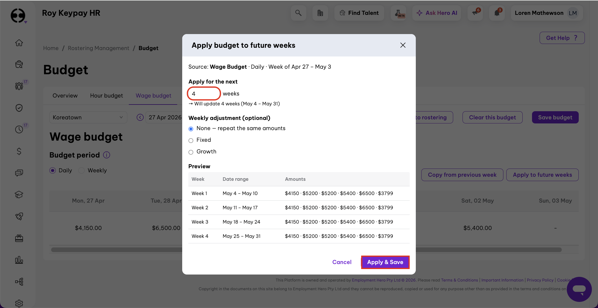 - In the Apply budget for future weeks pop-up, add in how many weeks you want to copy this budget for.