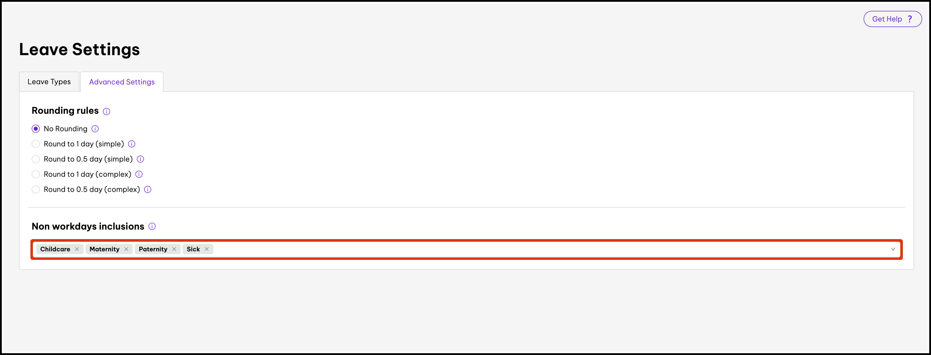 - Select the leave types that should include weekends and public holidays in their calculations. Common examples include: