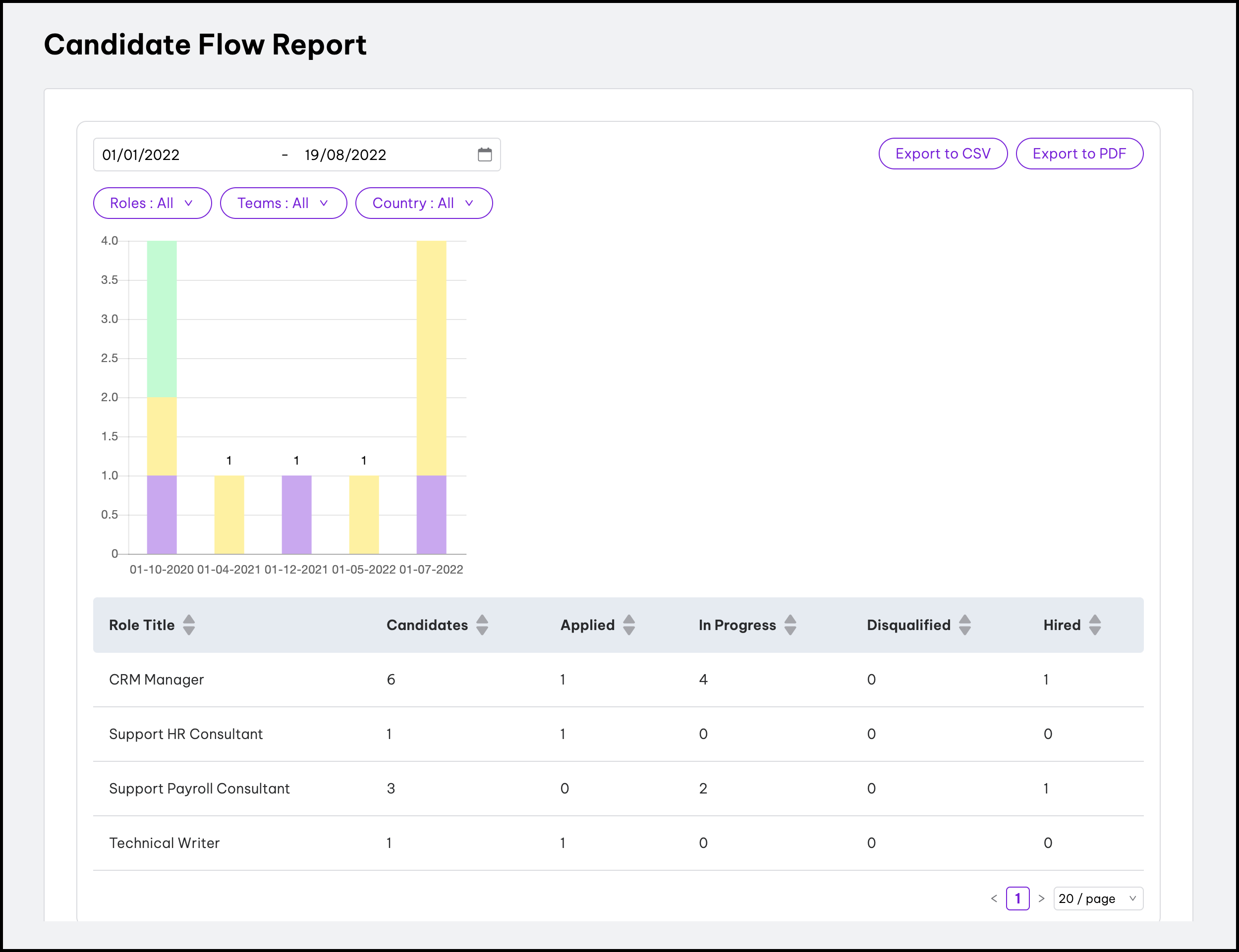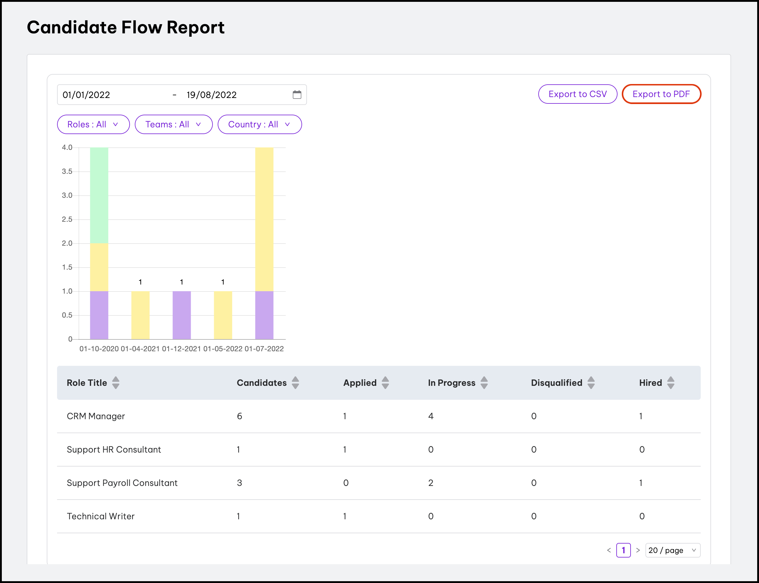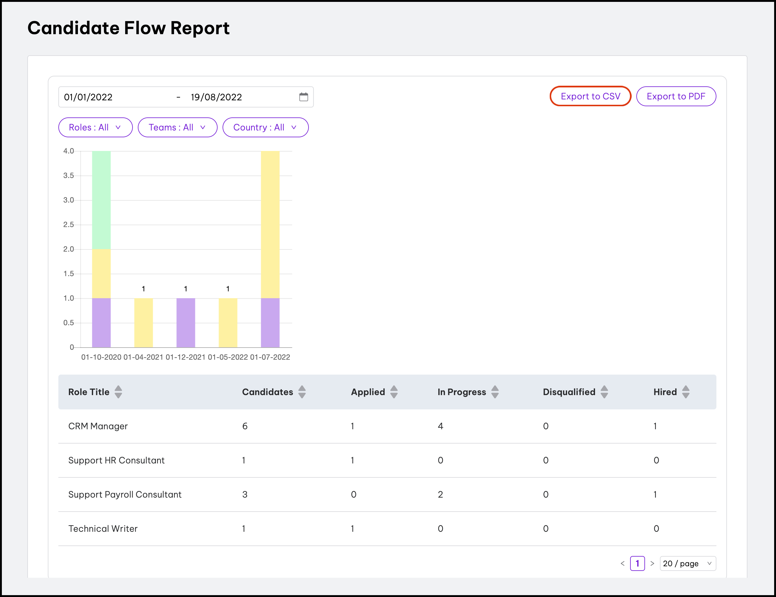 The Candidate Flow Reporting feature allows you to create a report on the number of candidates at each stage of your hiring process. You can also use this feature to download a CSV file of the data, enabling you to load the report into a CSV-supported program like Microsoft Excel, or as a PDF document you can share with an external user..
