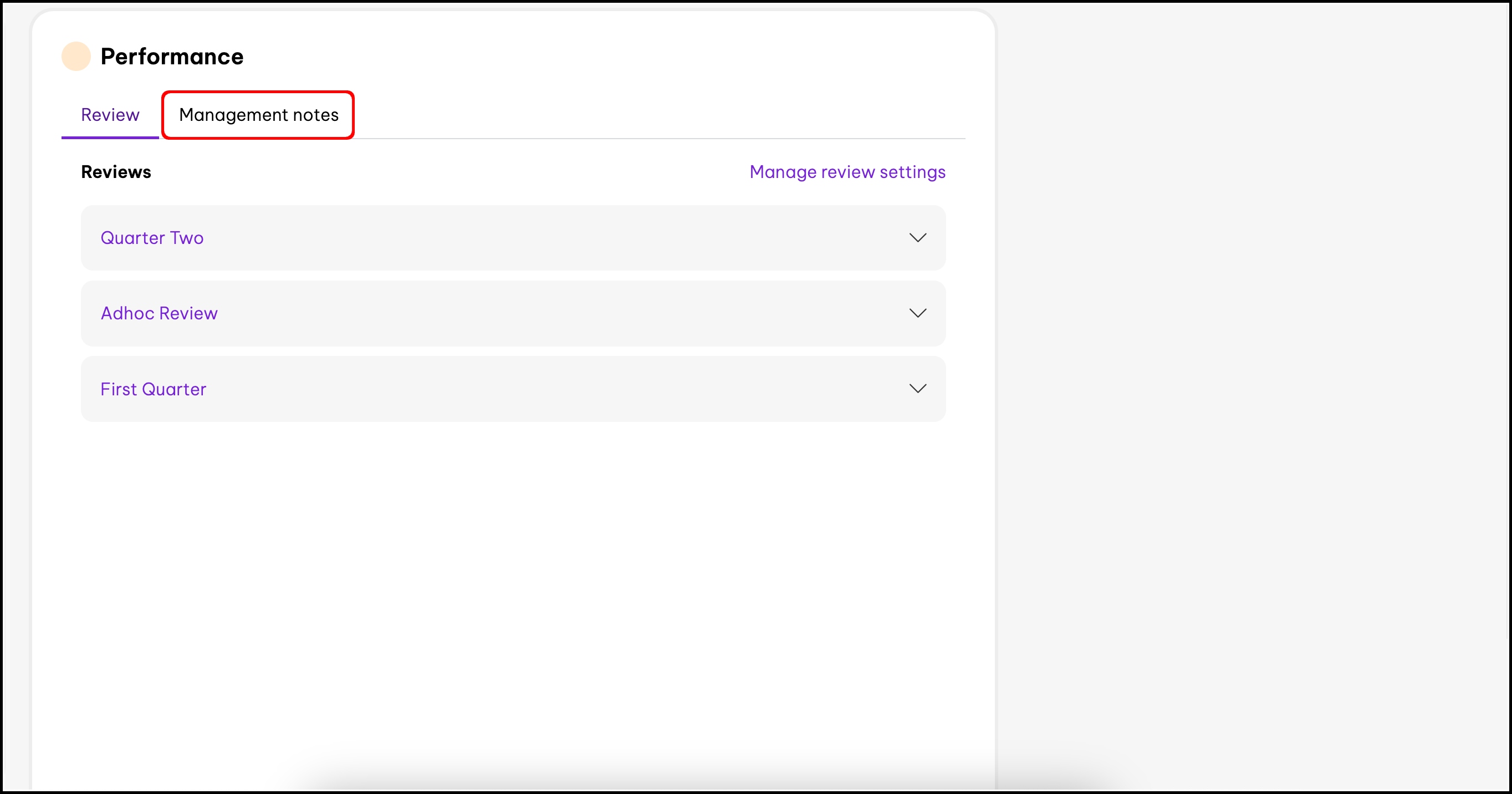 Management notes provide a flexible option for adding text-based notes to an employee's file. This feature also enables you to edit or delete these notes as needed. While the Performance Review feature displays specific details of an employee's performance review, such as completion state, progress status, and start and end dates. A Filter feature is also available, enabling you to customise the visibility of reviews based on specific time periods.