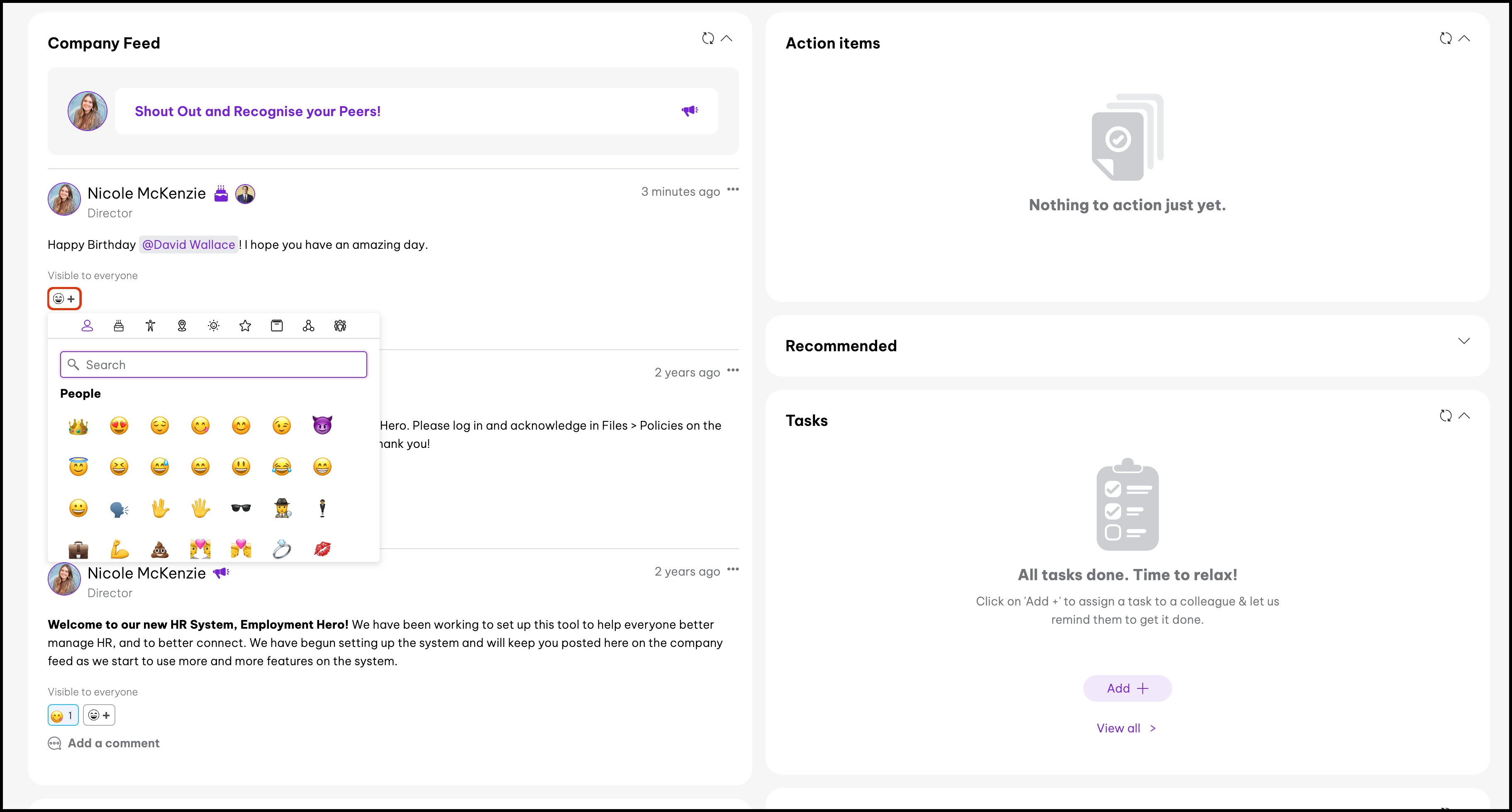 The Company Feed feature allows you to create a Shout Out, Recogntion, or Milestone post that your organisational users can view, react to, and comment on. Thereby creating a culture that promotes open communication, fosters morale, and makes sure employees feel appreciated for the work they do. You can also use this feature to post an announcement to your company feed that users can react to and comment on. Before being able to send a recognition post, you will need to have created company values and configured recognition settings.