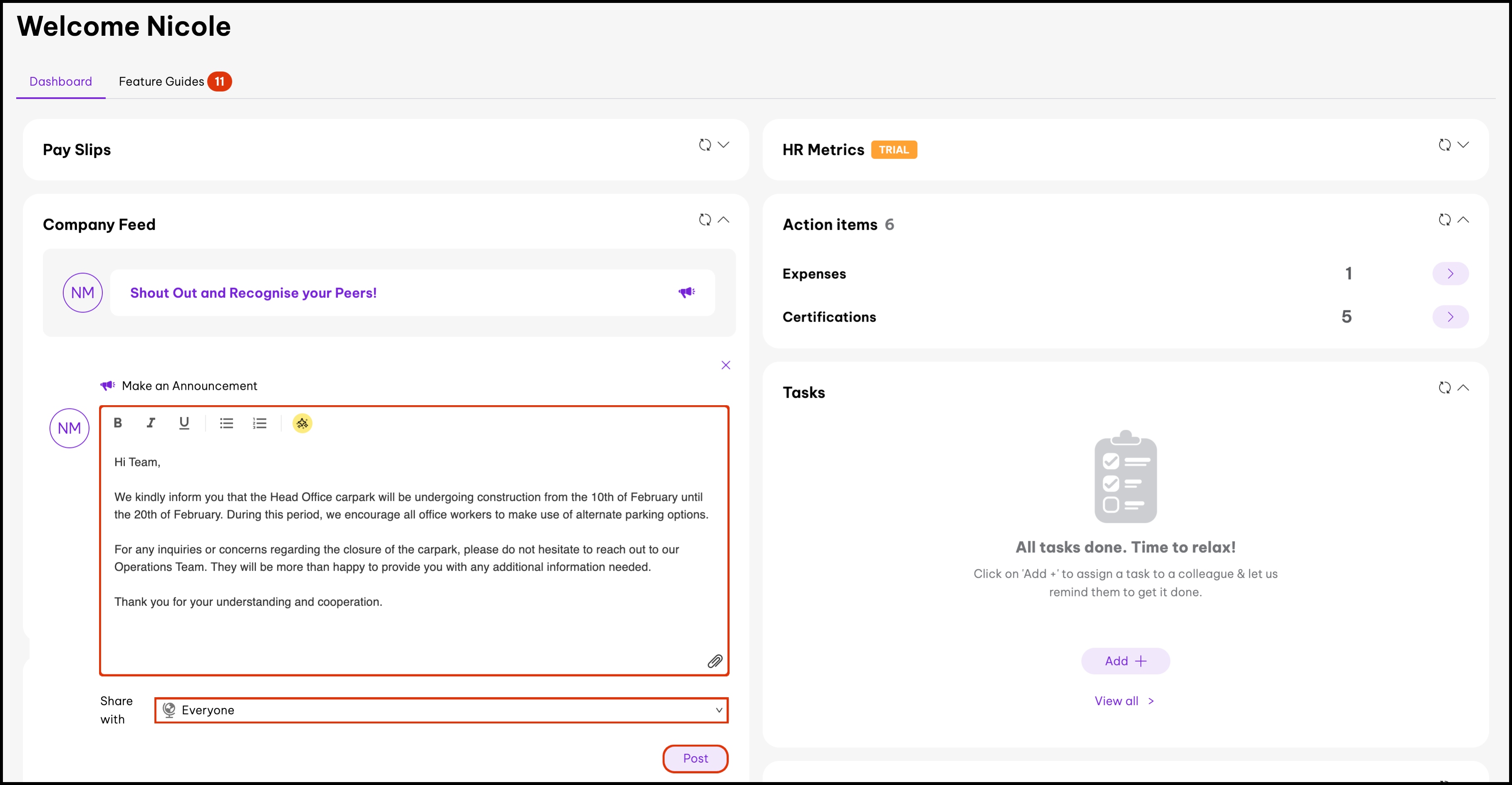 - Everyone: Every employee in your organisation will receive the announcement.
