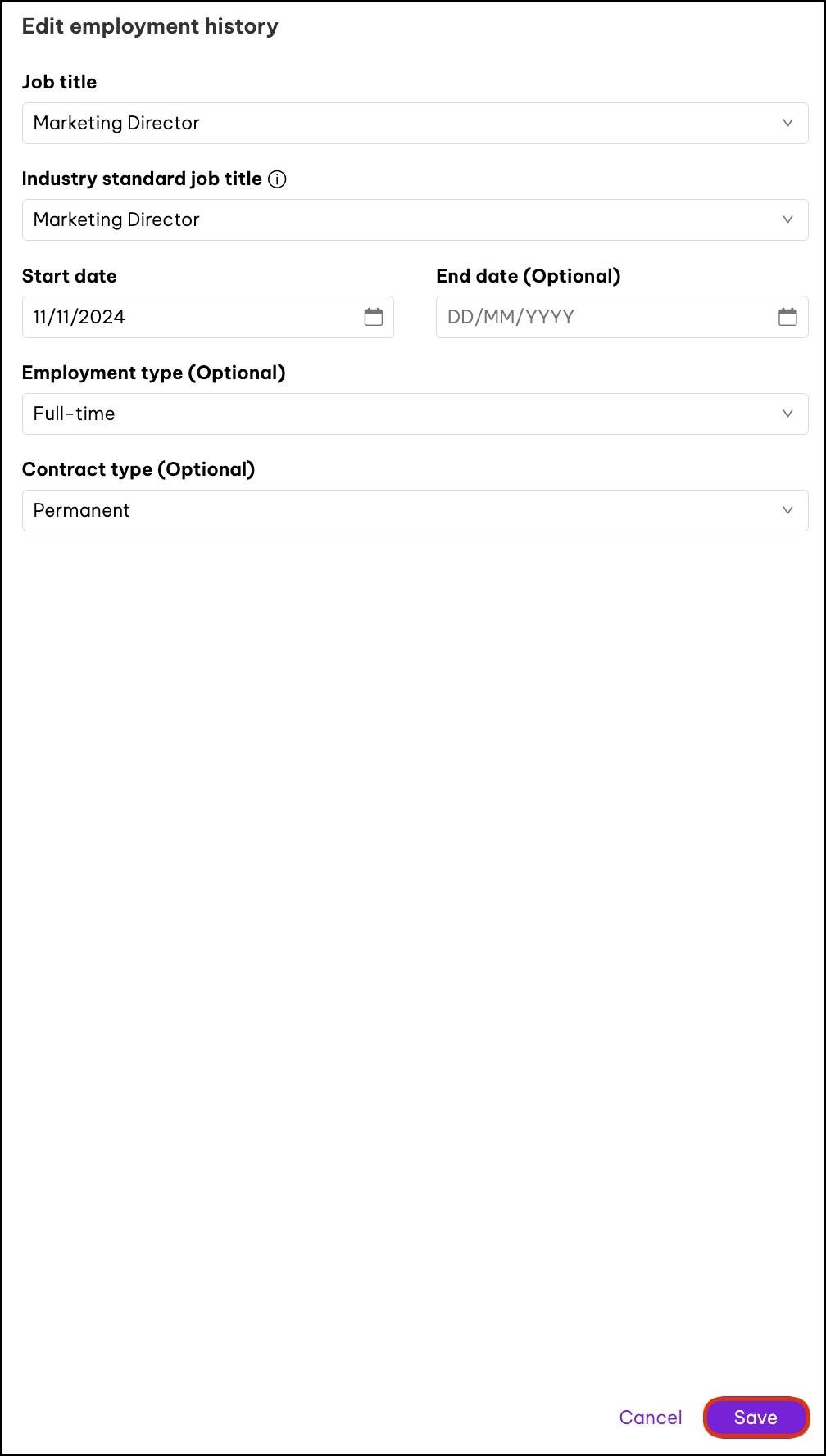 Use the End Date field for when the employee has a fixed end date or when the job description is only temporary. The end date is not a required field.