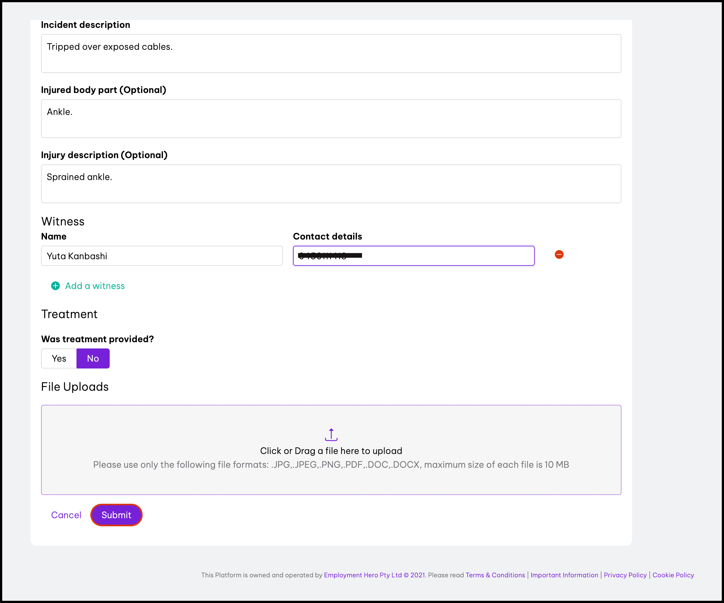 - Report a safety incident via Employment Hero Work This feature walks you through how your employees can use Employment Hero Work on their mobile phone to submit safety incidents on the go.