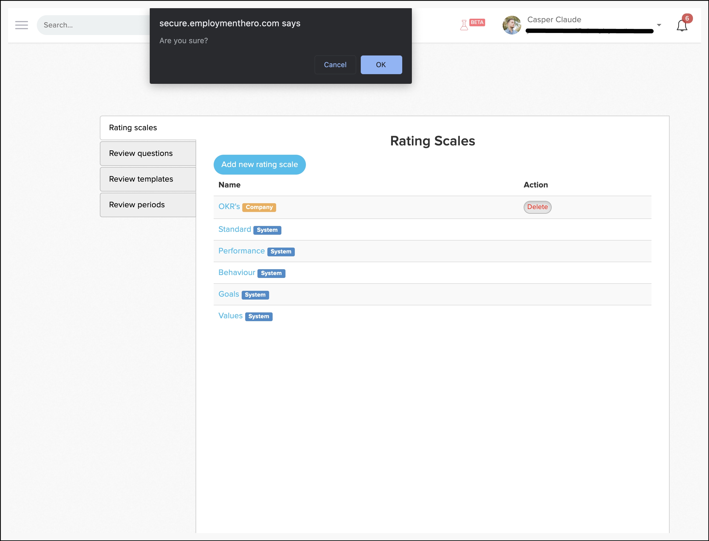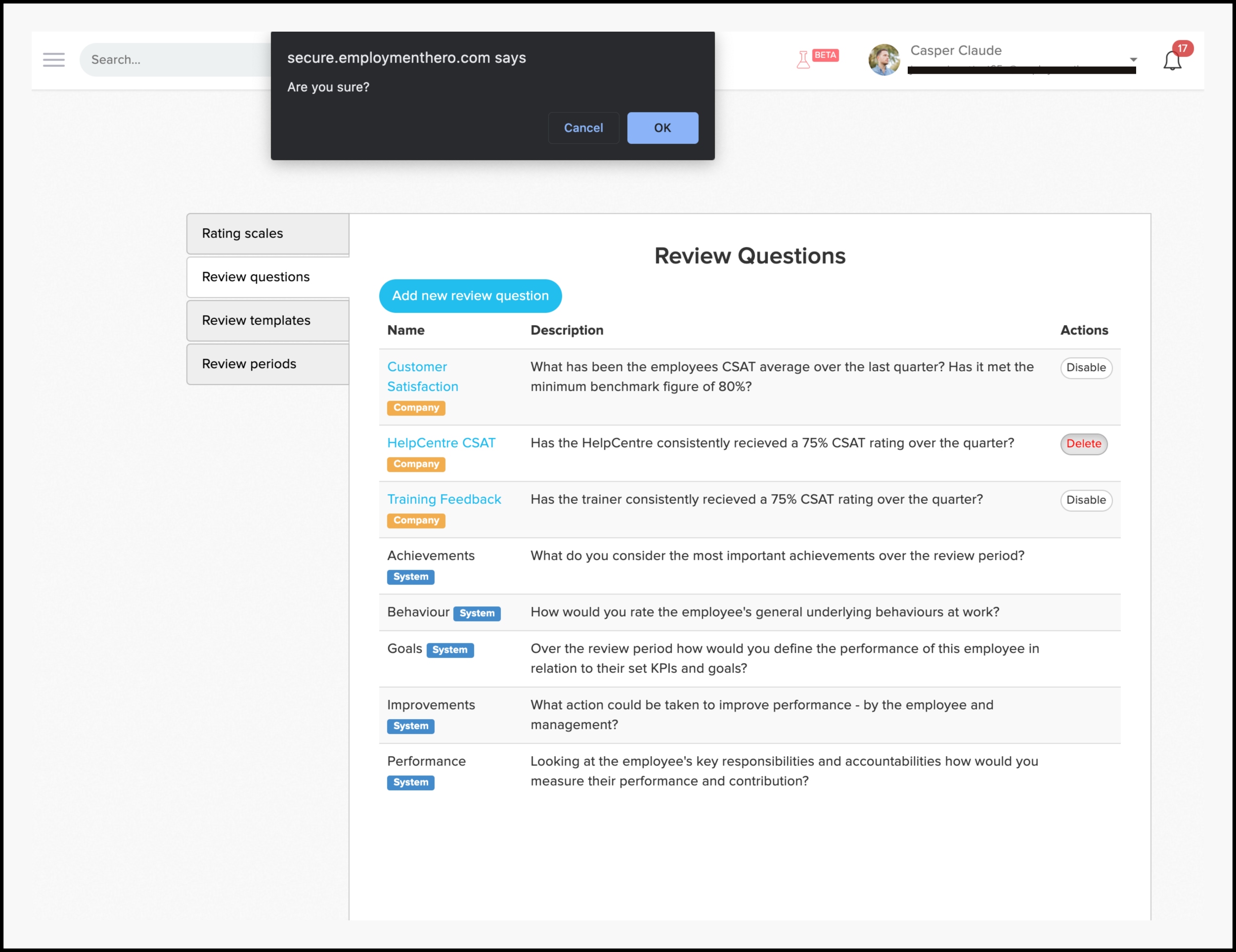 The initial step in building a performance review is developing a rating scale. This scale can be based on your organisation's values, key performance indicators (KPIs), targets, or specific behaviours and competencies. The next step in building a performance review is developing a review question. This  feature lets you formulate custom questions or utilise templates provided by Employment Hero. Like the rating scales, these questions can be edited or deleted as needed based on their importance or changes in focus.