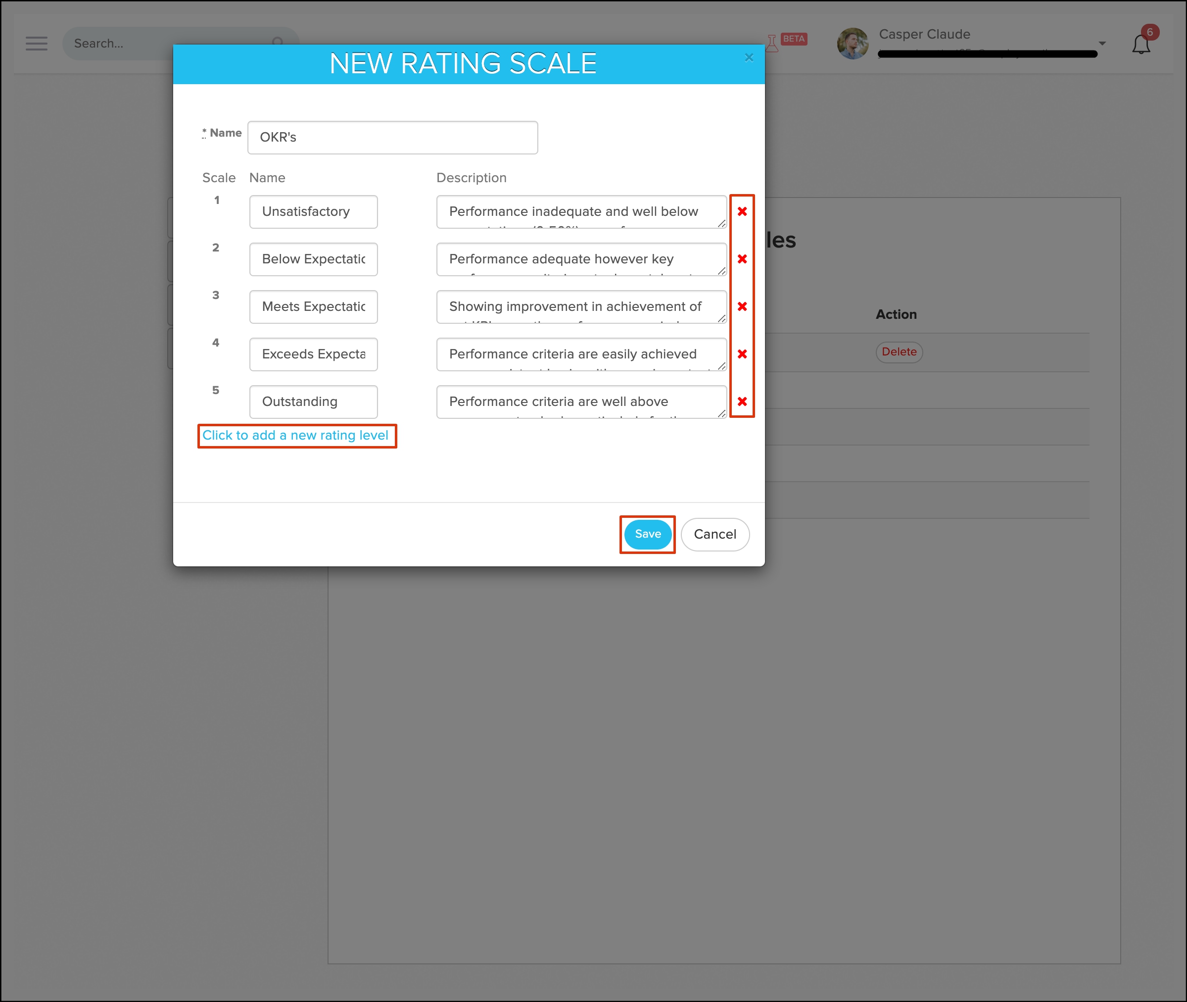 You can use the Click to Add a New Rating Level button to add another scale name and a description field, and the Delete button to remove a scale name and a description field.