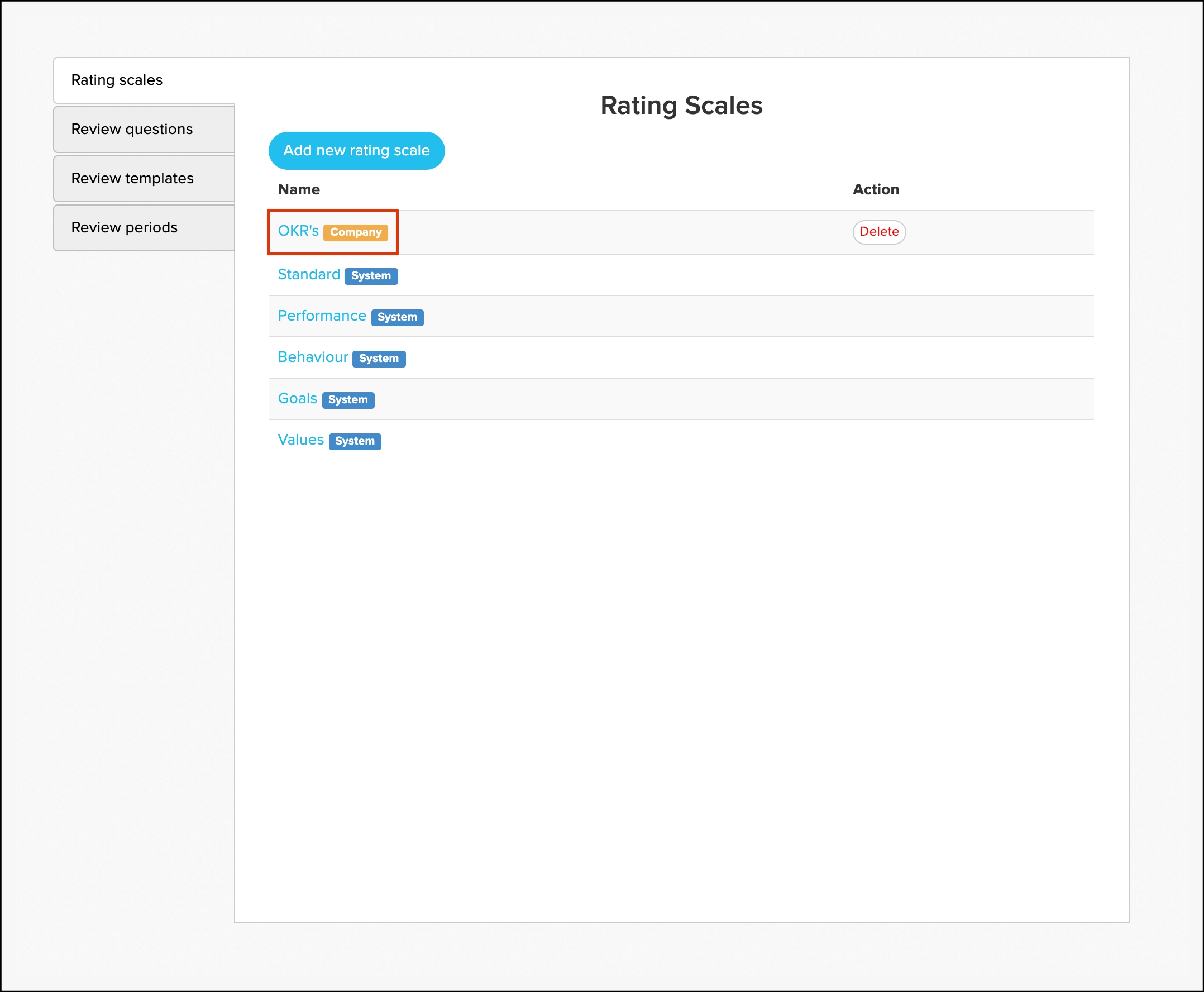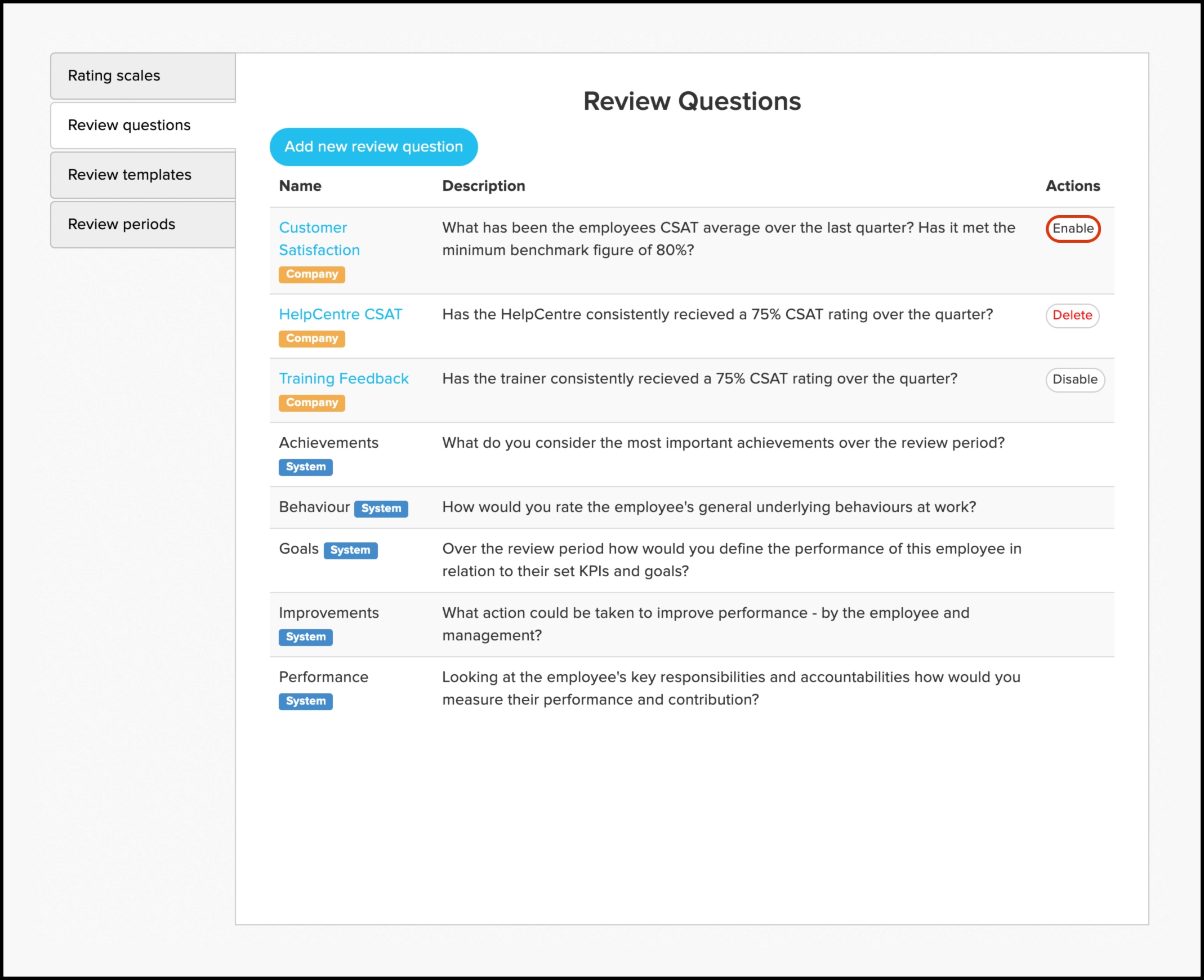 Configure performance review rating scales and questions