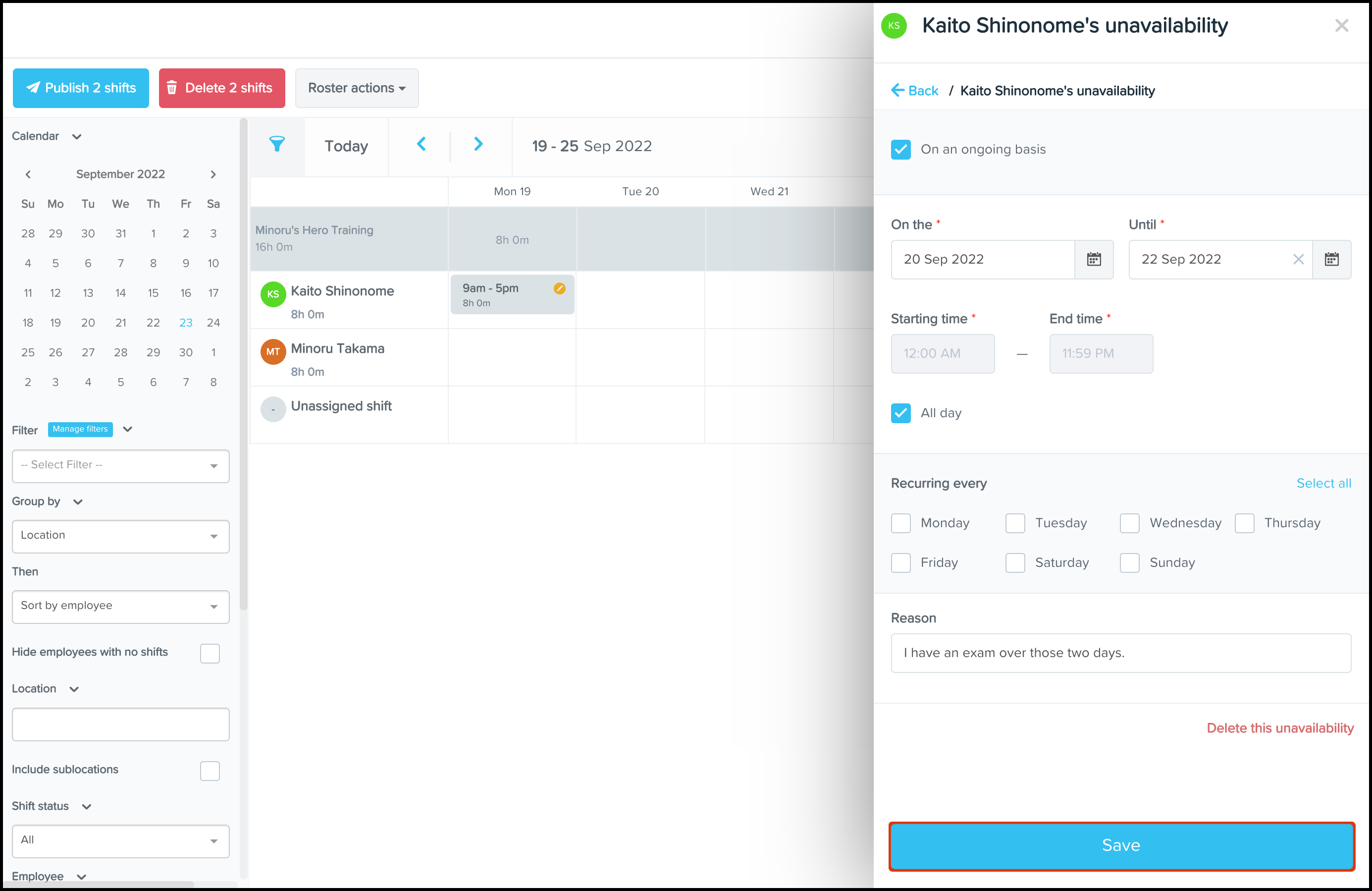 The Rostering module has an Employee Unavailability feature that allows you or your employees to enter the date and time for when they will be unavailable for a shift. You can also use this feature to edit the unavailability details if they change and delete a record if it is no longer required.