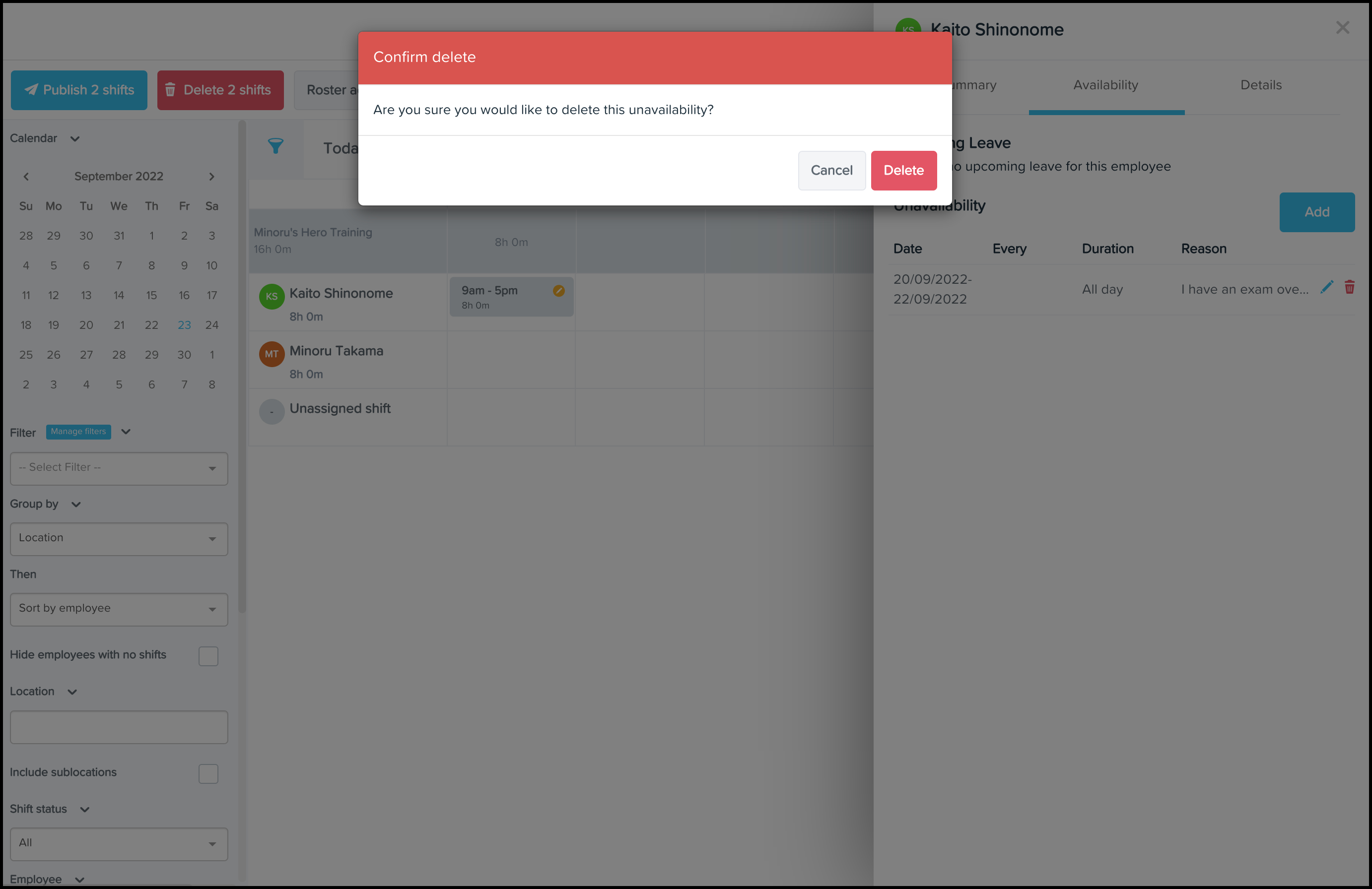 • Delete an existing employee unavailability record. If a record is deleted, the employee should receive a notification advising as such, including the details of the unavailability that was deleted;