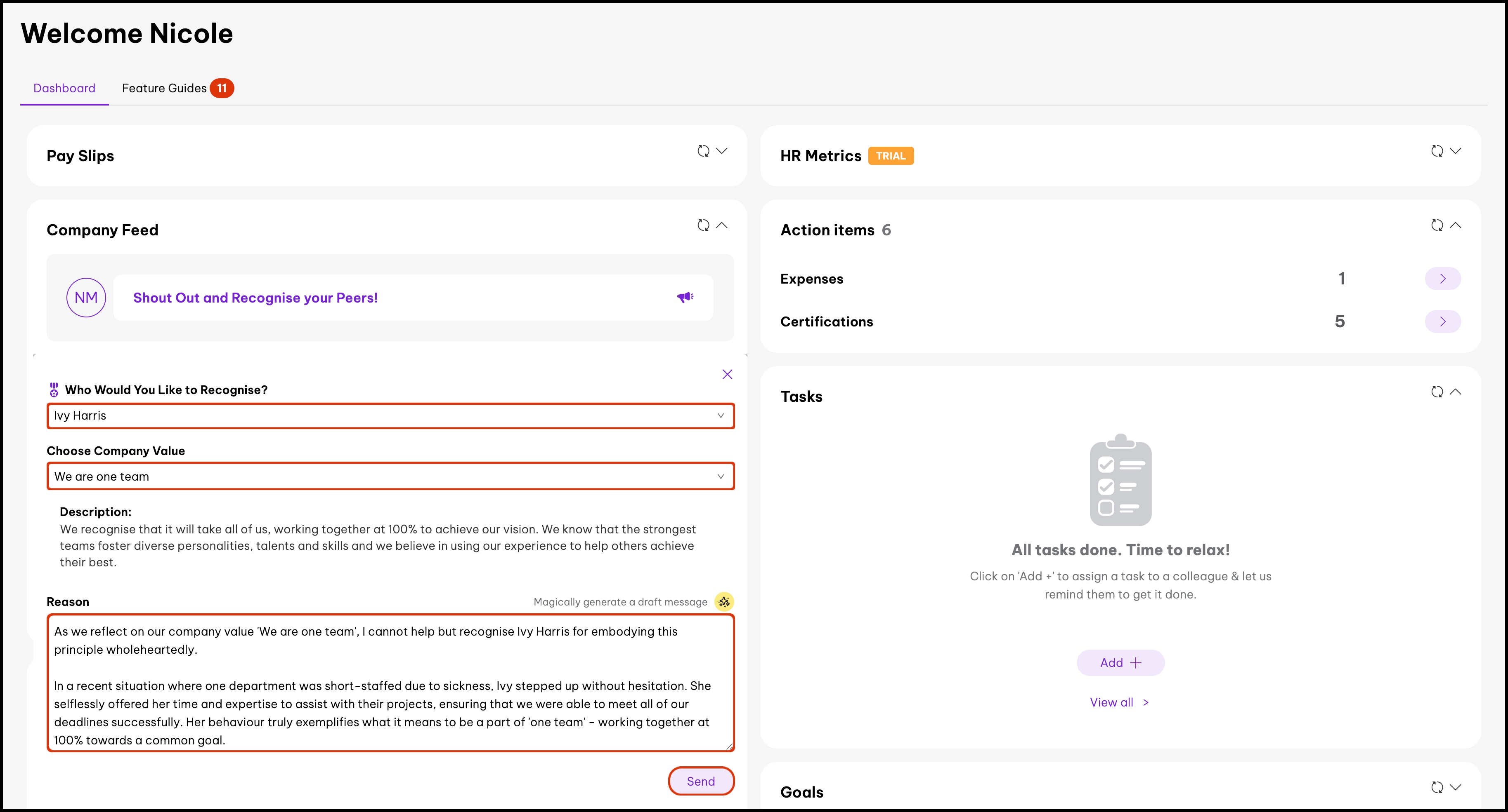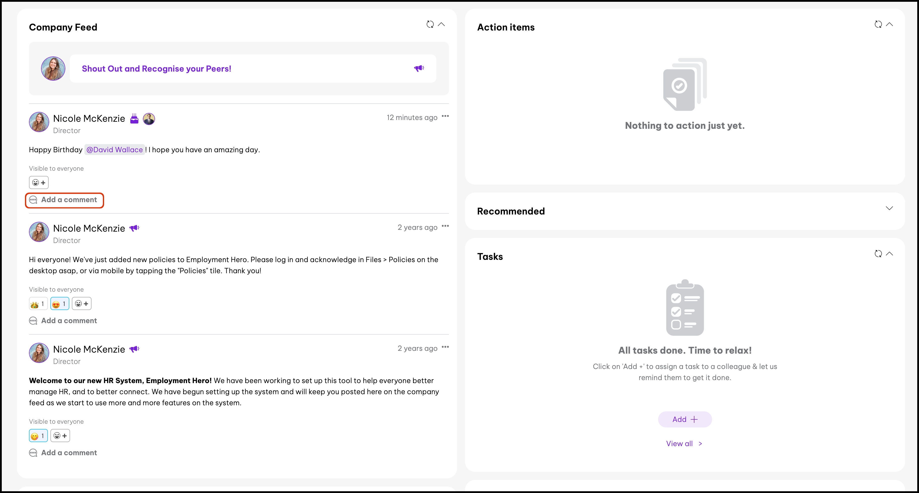 The Recognition feature on the company feed allows you to do just this, post a public message to the whole organisation showcasing a coworker who lives up to your organisation's values. You can also use this feature to comment on a recognition made by yourself or another employee, and if you made the comment, delete this information if needed. Before being able to use the recognition feature, you will need to have: