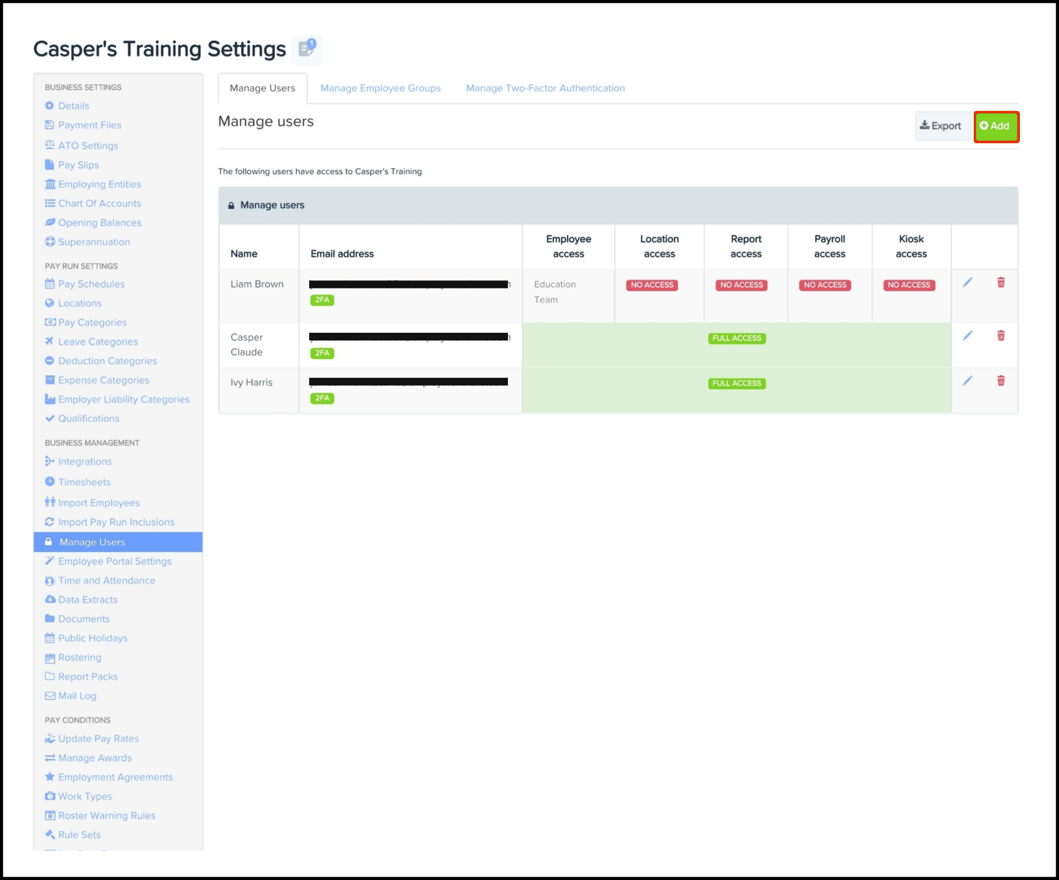 The payroll platform does not have an owner, like the HR platform does. Instead, having full access is the highest authority.- Log into your Employment Hero Payroll platform.
