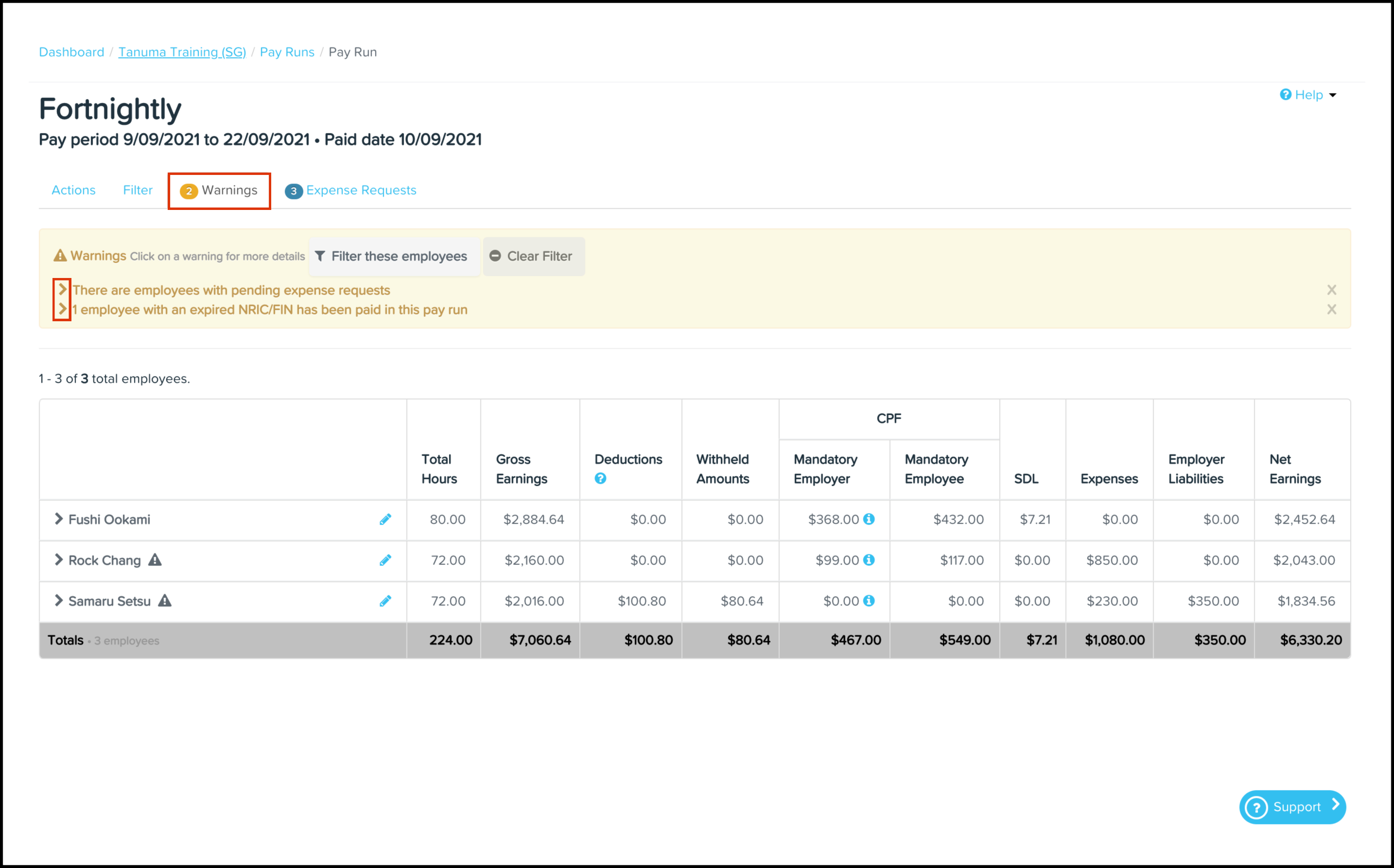 | Employee with expired NRIC/FIN number. | The platform displays this warning when an employee has an expired NRIC/FIN number. |