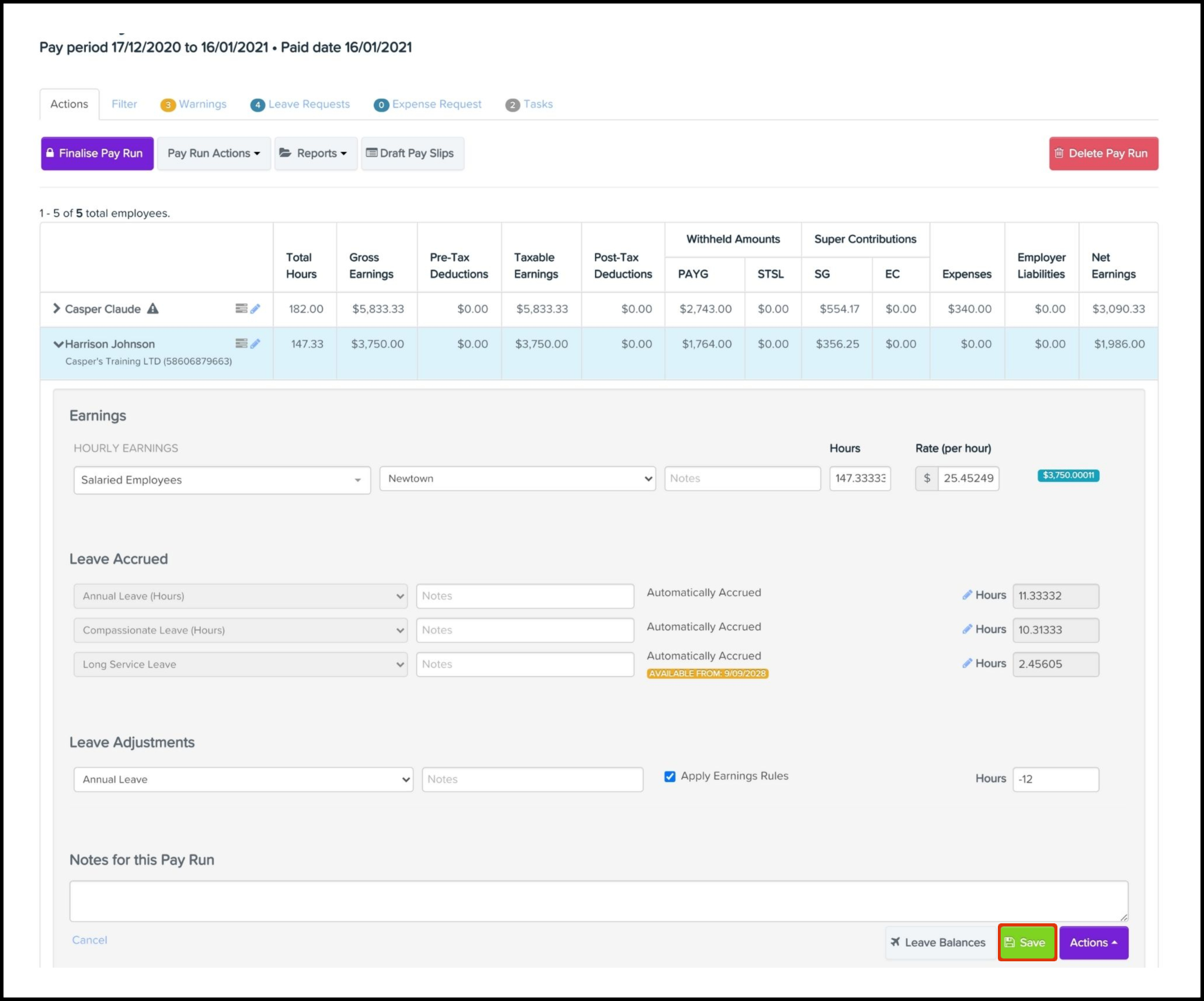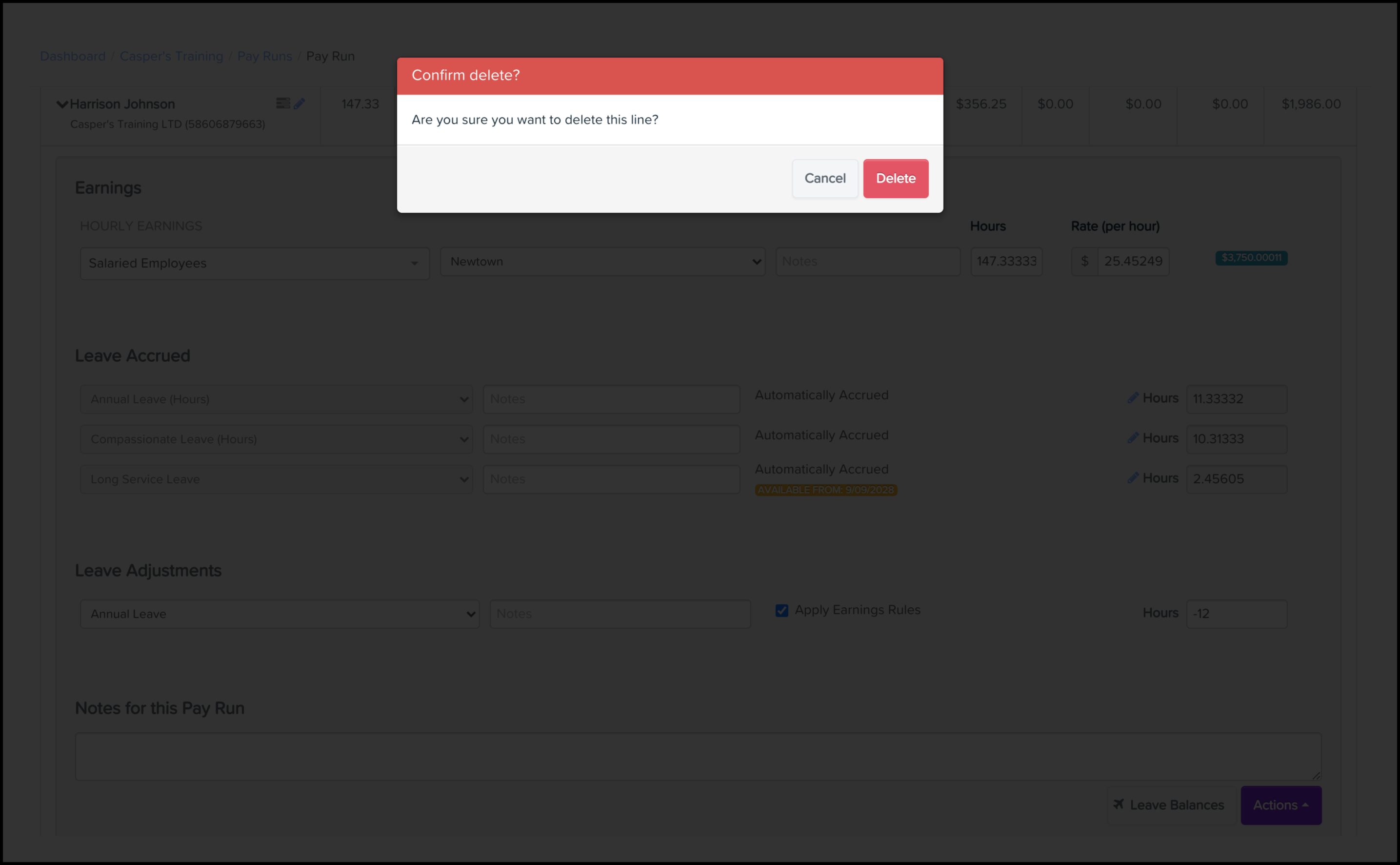 This will offset previous leave taken, earnings figures, and correct both the pay category and balance. The resultant Leave Adjustment will also create an earnings line for the employee, effectively showing that adjustments were made to their leave.