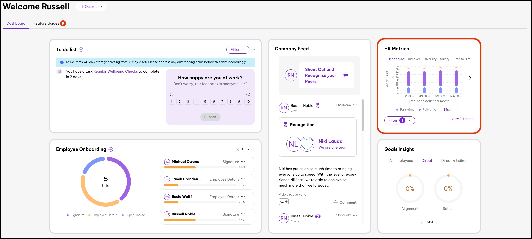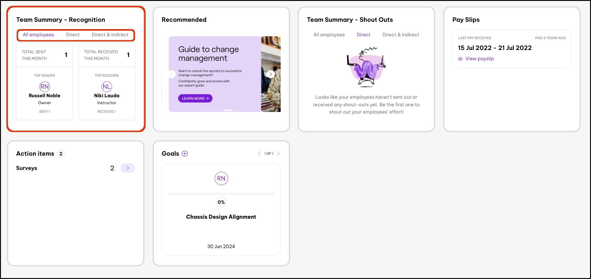 Your dashboard has a range of widgets that you can use to review real-time information about your organisation and how your teams are performing. The below article will cover the Recognition Team summary widgets, with one widget focused on shout-outs and the other recogntion. While the celebrations widget focuses on current and upcoming birthdays and work anniversaries. We also have the HR metrics widget that gives real-time reports like salary data and the Goals insight widgets that lets you view how your organisation's goals are progressing.