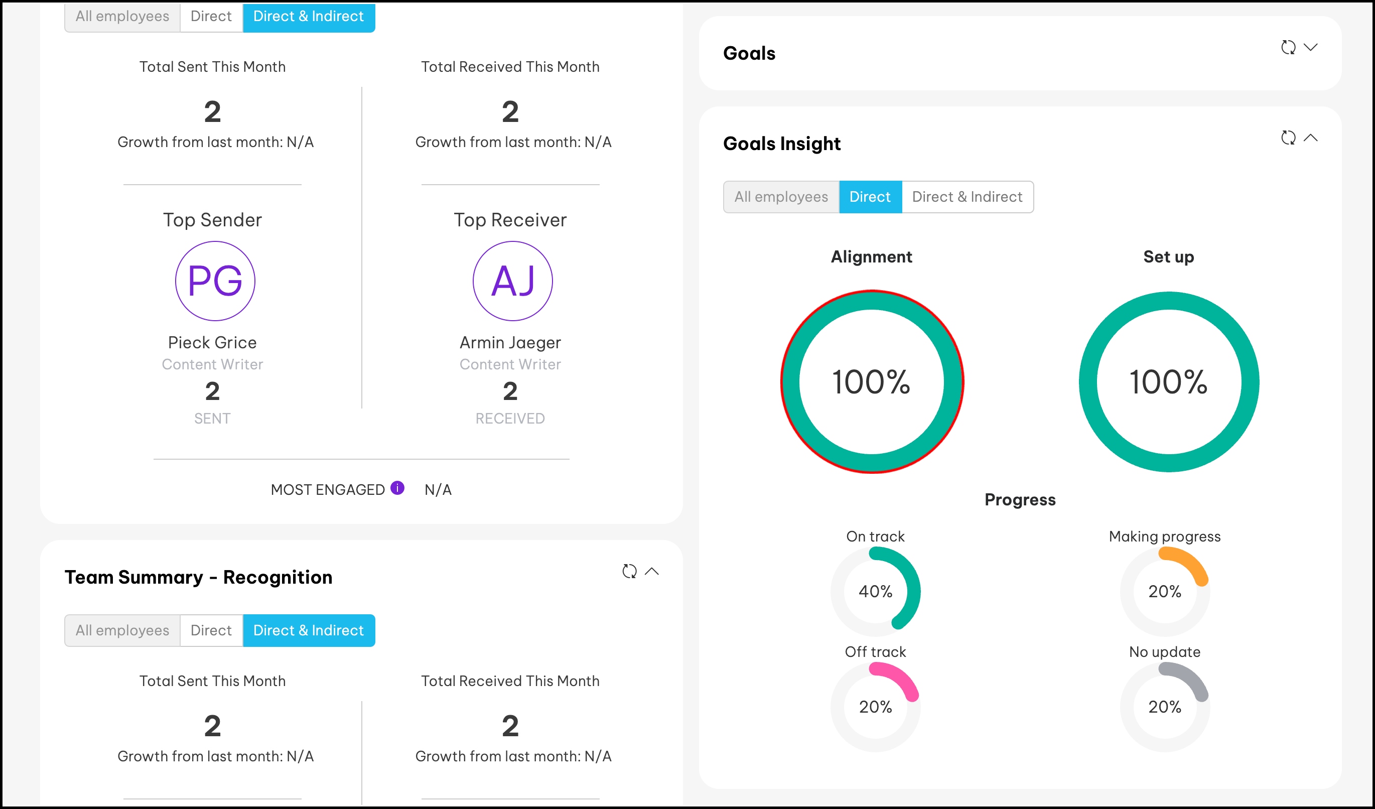 Alignment shows the percentage of employee goals that are in alignment with your company goals. Set-up shows the percentage of employees assigned to a goal. Progress shows the progress percentage of your goal, not the individual progress of each key result. The status is broken down into four key areas: