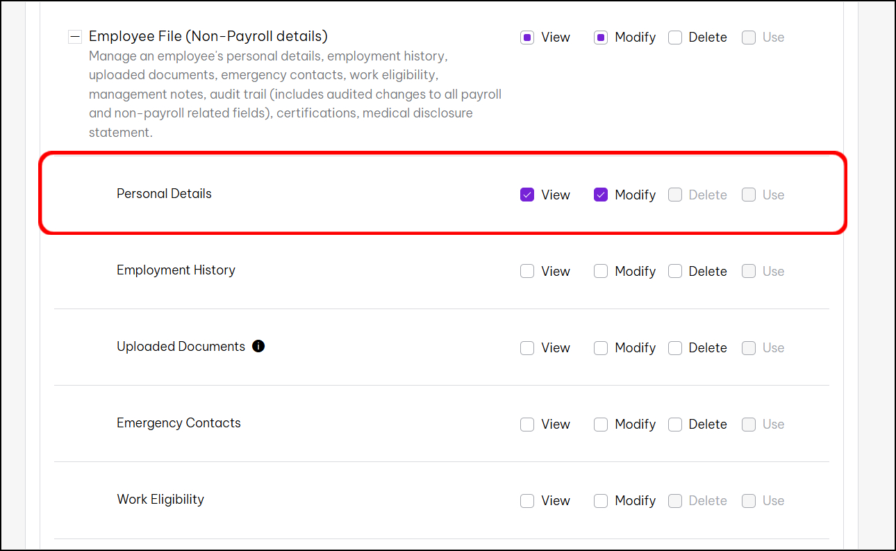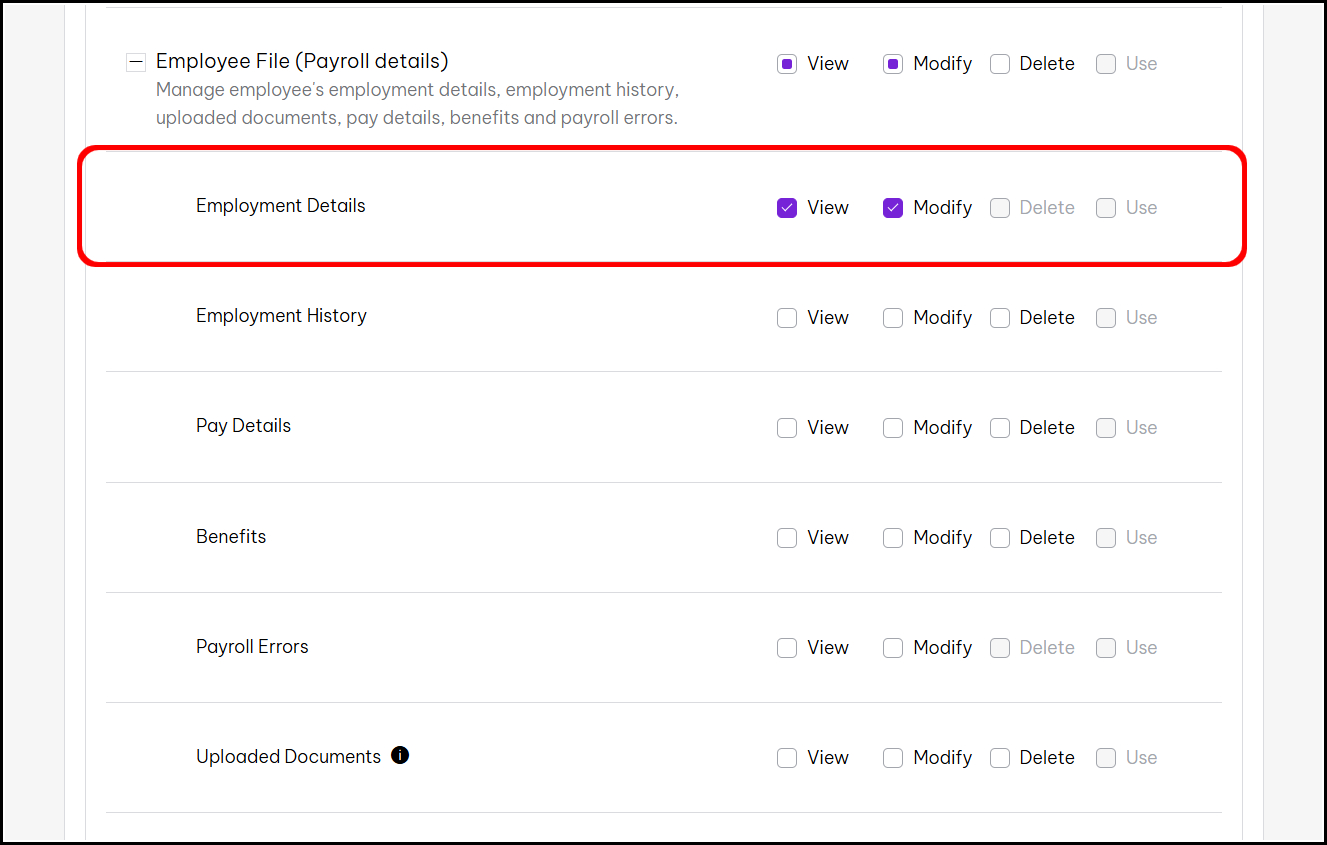 - To set permissions to view work anniversaries, scroll down to Employee File (Payroll details) and tick the View and Modify options. It is next to the Employment Details section.