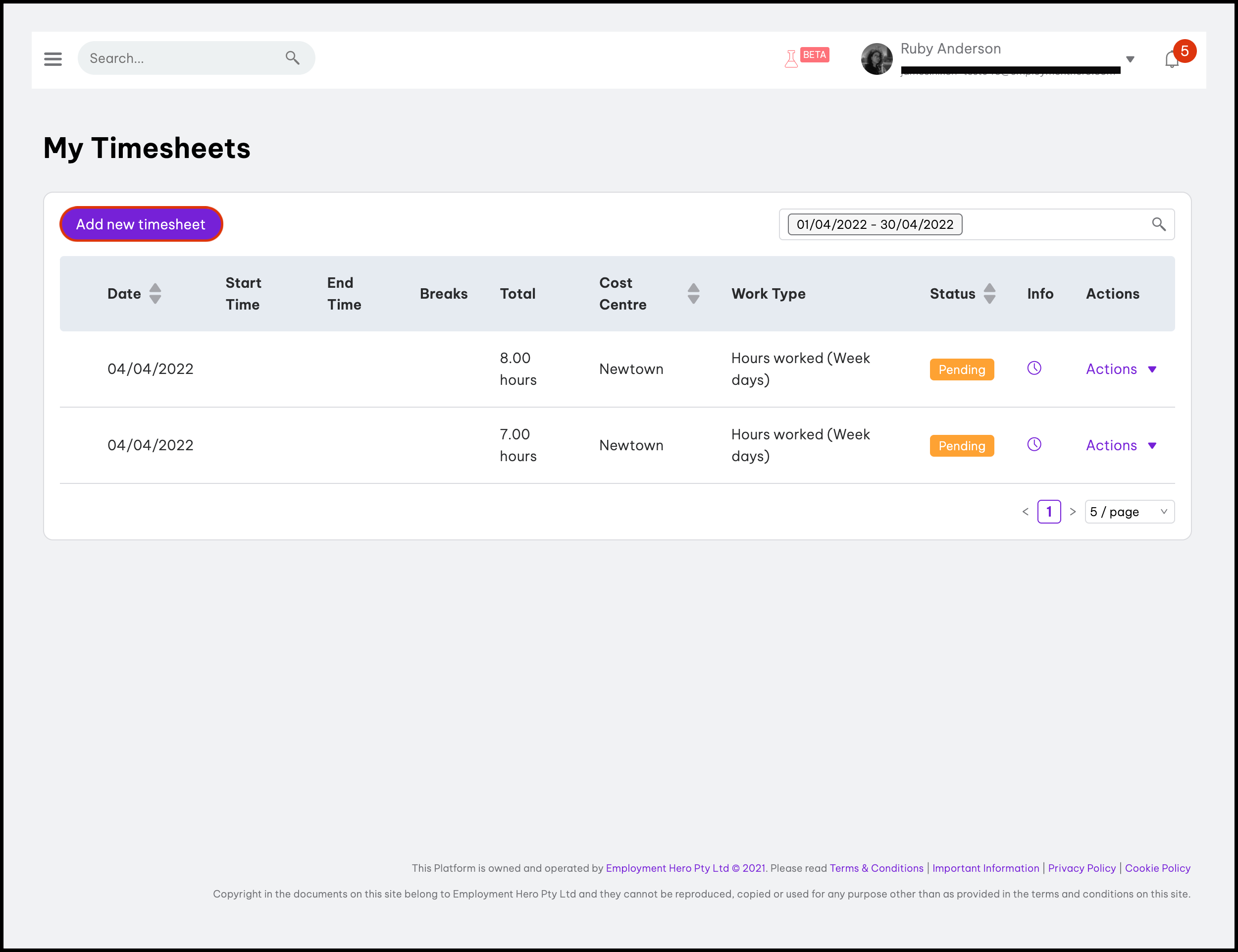 | Purple clock. | Used for pending or declined timesheets that have not synchronised with Employment Hero Payroll. | |