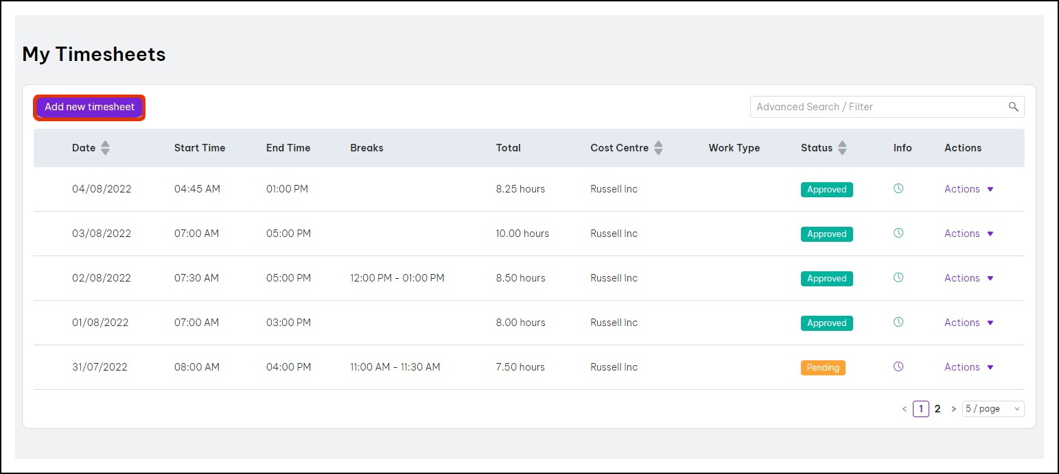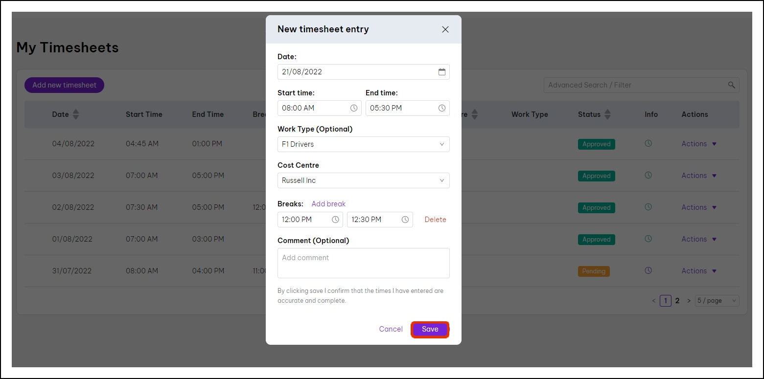 - Click the Add new timesheet button.