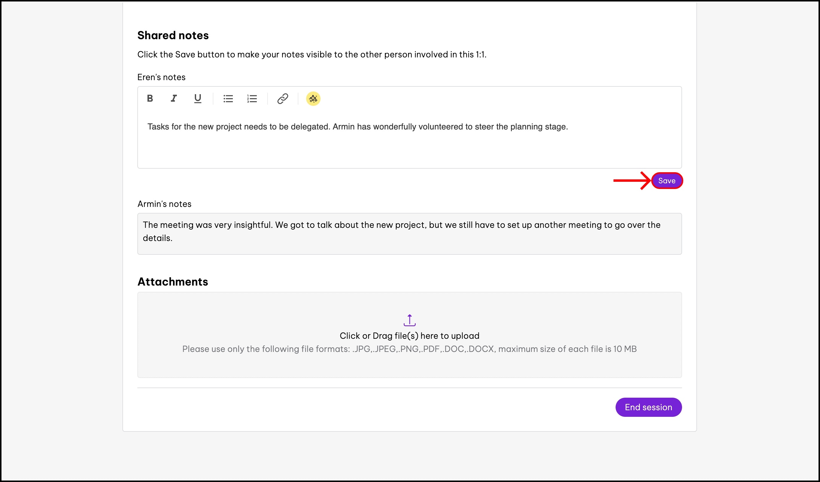 screenshot of the one on one page, highlighting the arrow and save buttons