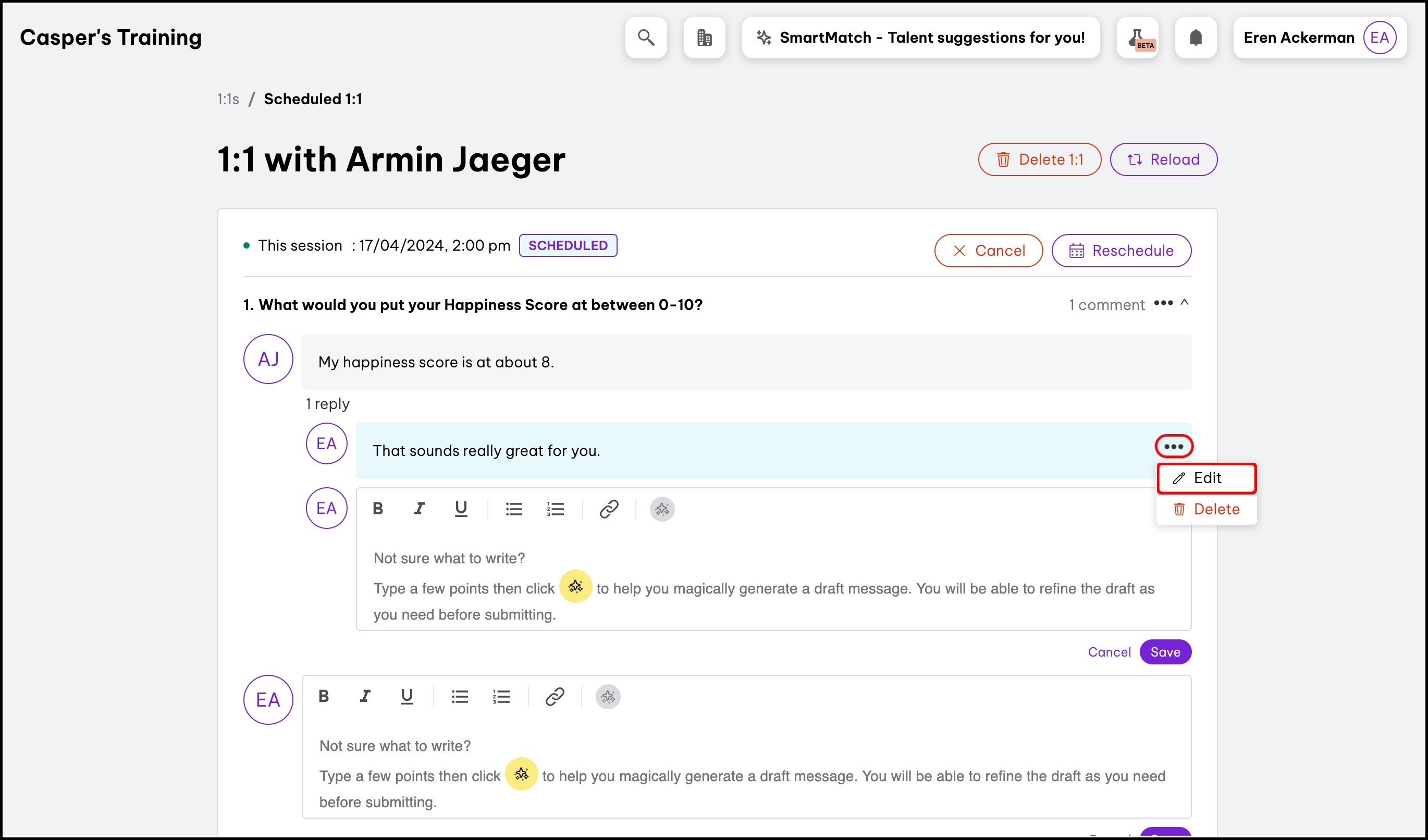 screenshot of the one on one page, highlighting the three dots and edit button for a reply