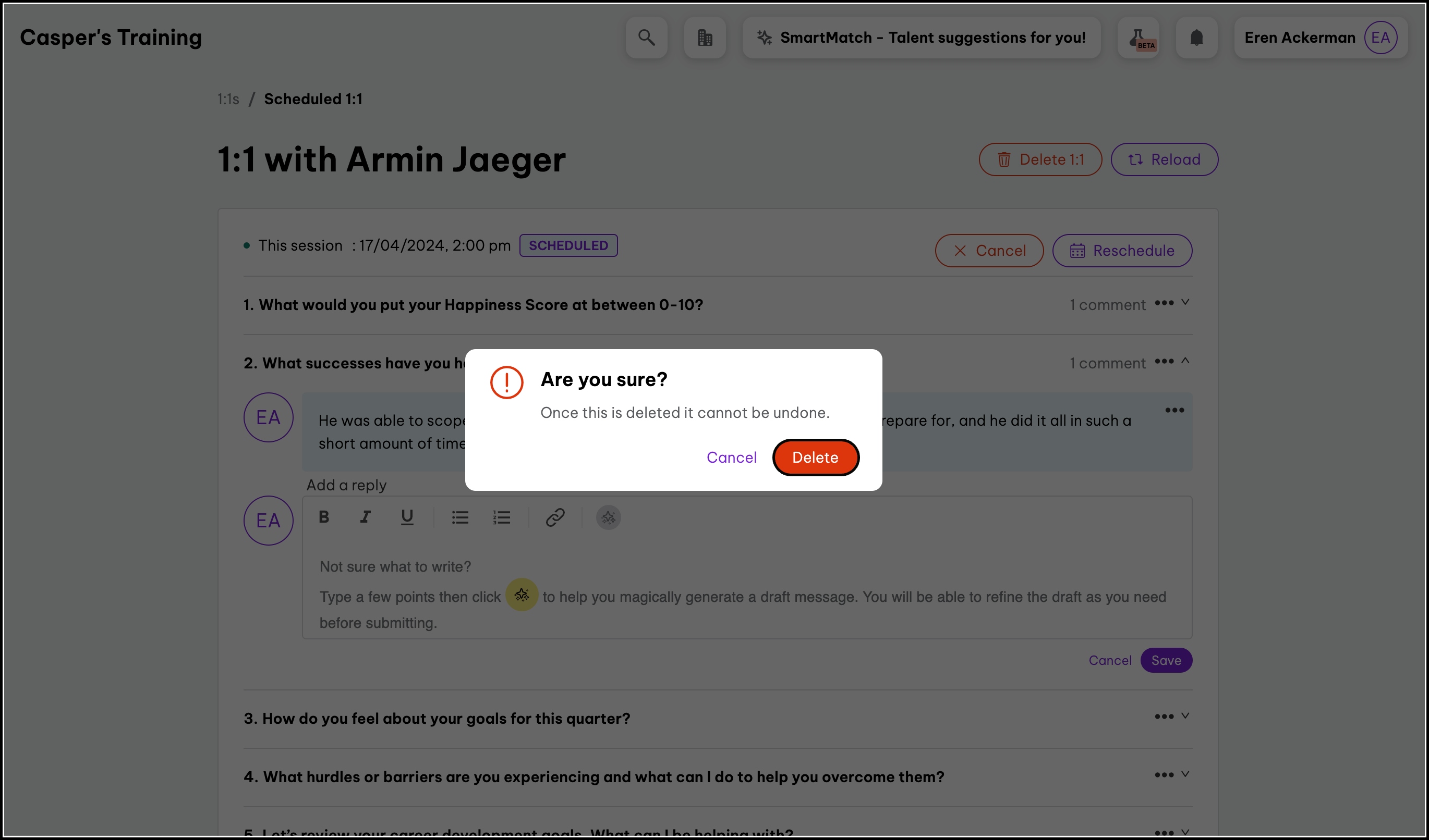 The Running a 1:1 Session feature enables you to schedule one-on-one meetings with your employees, where you can set pre-determined or spontaneous talking points. It includes note-taking and commenting functionality for recording discussions during ‌the meeting. You can edit these sessions if details change or delete them if created in error. The feature is not restricted to the employee's primary manager; any business member, including mentors or platform admins, can conduct 1:1.  For more details, including how to handle manager changes and edit recurring 1:1s, please refer to the Further Information section of this article.