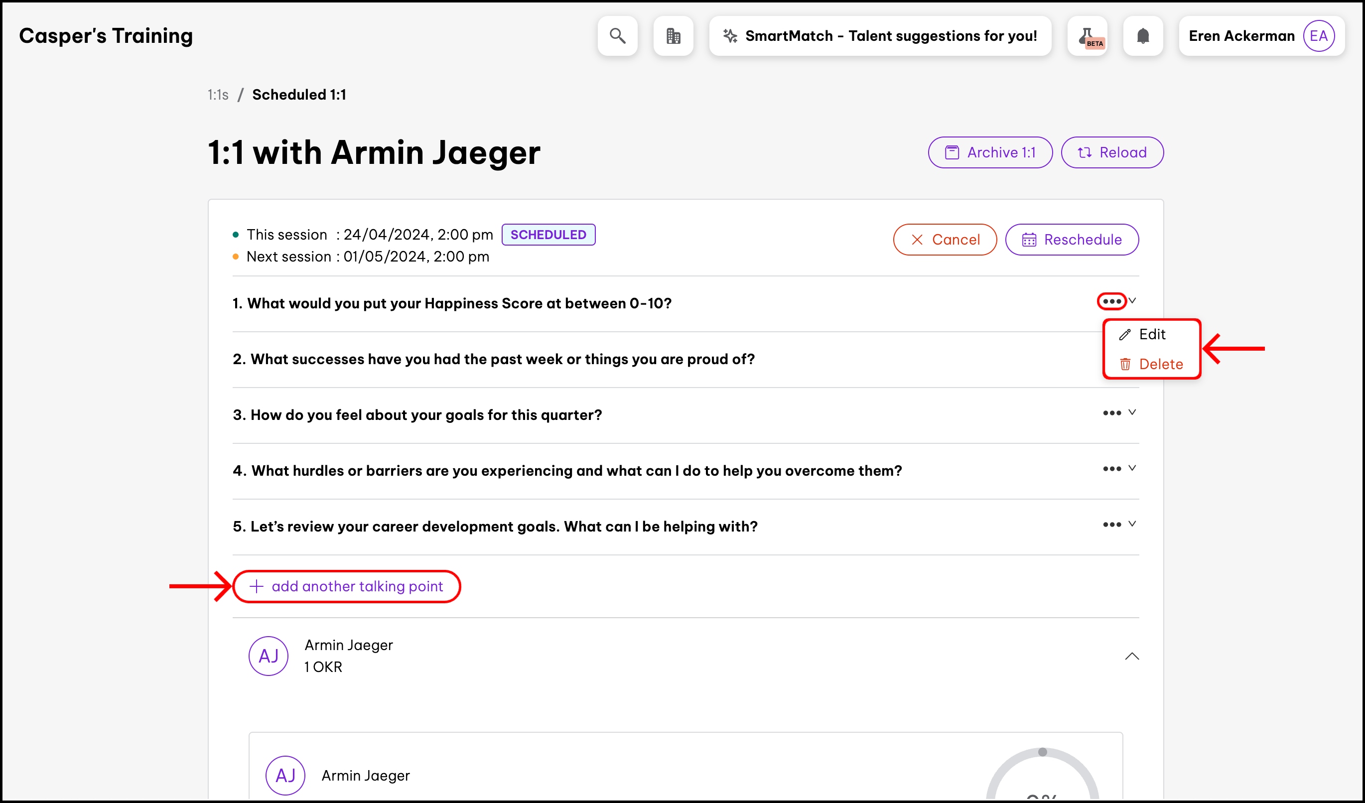 screenshot of the one on one page, highlighting the edit, delete, and add talking points buttons