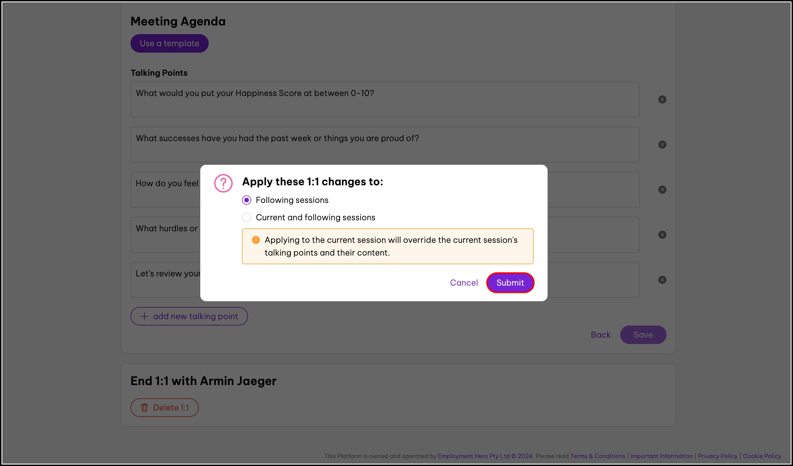 When you click the Edit button within the Action column, you will open an editing page that lets you update the supporting template for all planned and scheduled 1:1s. With the option of applying the changes to your following sessions. Following sessions means the next one-on-one after the current scheduled event. However, if you click the title of a current or next planned session, this will give you the ability to edit this coming meeting only. It will not change the template of the sessions scheduled following this one-on-one.
